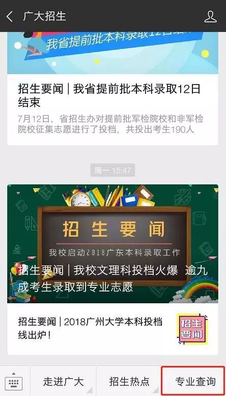 02、关注“广大招生”微信公众号,点击“专业查询”: