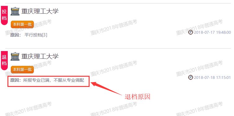同学们在查询录取轨迹时,如果有退档信息,均会同时公布退档原因。