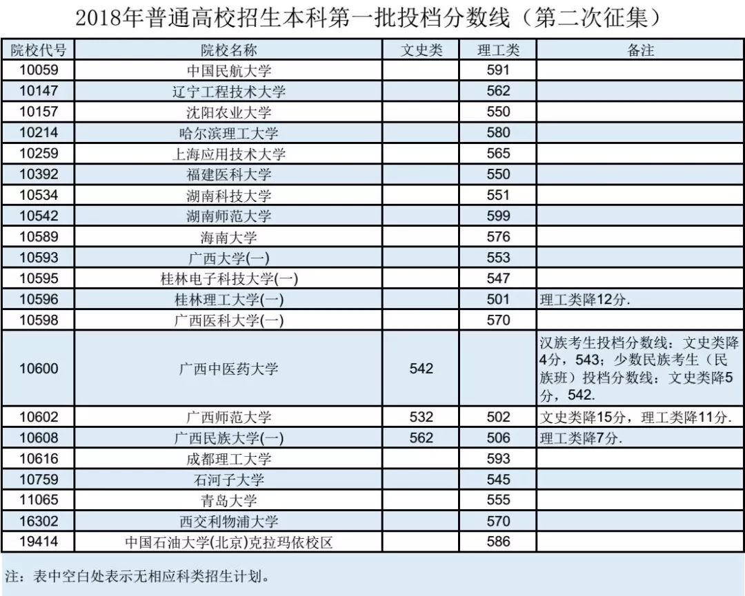 广西2018年普通高校招生本科第一批投档分数线(第二次征集)