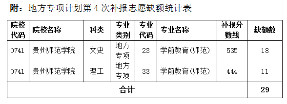 地方专项计划第3次补报志愿平行投档后,贵州师范学院因生源不足,仍有缺额,现降40分补报志愿。地方专项计划报考资格审查合格的考生可根据缺额情况,及时补报志愿。具体要求如下: