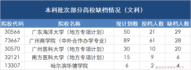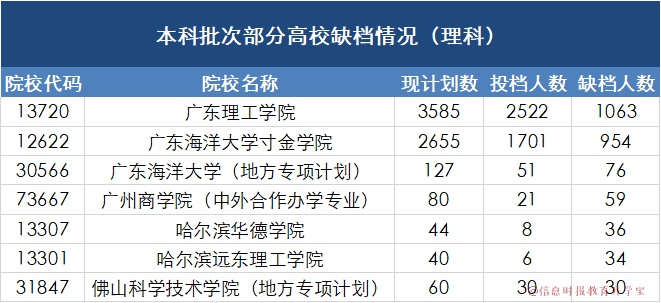 不过相对于文科,理科方面缺档人数就较多了。其中,广东理工学院今年计划招生数为3585,而投档人数只有2522,这也就是说缺档人数还有1063人;与此同时,广东海洋大学寸金学院的缺档人数也较多,还有954个名额。除此之外,广东海洋大学(地方专项计划)还有76个名额,广州商学院(中外合作办学专业)也有59个名额。
