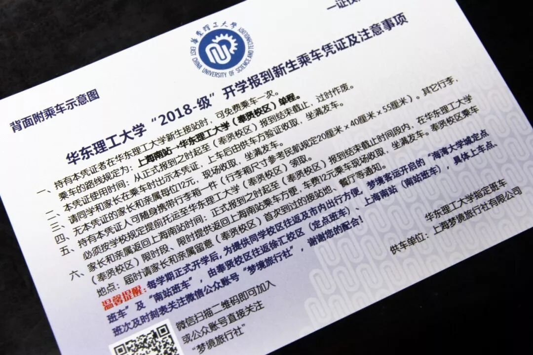 为了方便小伙伴们乘车前往奉贤校区,我们还准备了“免费乘车凭证”(3张)。有了它,你可以在上海南站“华东理工大学新生接站点”免费乘坐接站车辆前往奉贤校区哦。