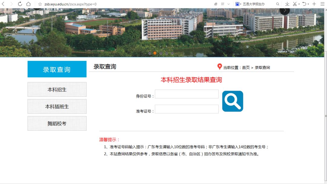 各位亲爱的考生及家长朋友们 我校现已开通录取结果查询通道,可查询广东省本科批次文理类录取结果。其他录取结束省份结果查询将在各省该批次录取结束后上线,请各位考生和家长留意五邑大学招生办微信公众号及五邑大学招生办官网最新通知。 查询方式如下 在浏览器中输入网址 http://zsb.wyu.edu.cn/zscx.aspx?type=0 进入录取查询页面。 输入准考证号、考生18位身份证号即可查询。 为什么有的同学查不到呢?↓↓↓ 1、考生信息输入有误,请确保输入信息准确。 2、考生所在省份的对应批次的录取工作还未结束,留意五邑大学招生办微信公众号最新推送,录取结束的省份可进行查询。 3、考生未被录取。 注意:正式录取结果请以各省考试院(高招办)和录取通知书为准。 未公布录取结果的省份(批次),其录取工作将根据各省招办安排进行,五邑大学招生办公室将持续更新。 录取通知书将于七月底八月初统一邮寄,咨询方式等也敬请关注”五邑大学招生办”微信公众号,录取通知书邮寄信息也将在本公众号通知。