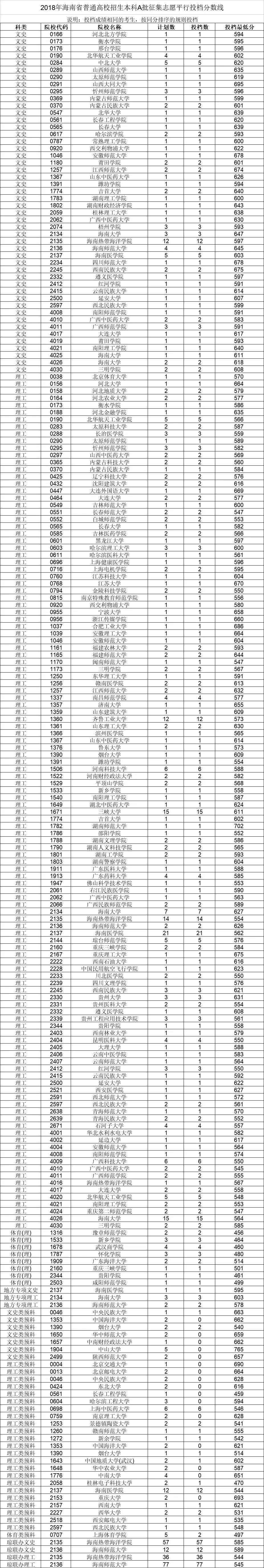2018年海南省普通高校招生本科A批征集志愿平行投档分数线
