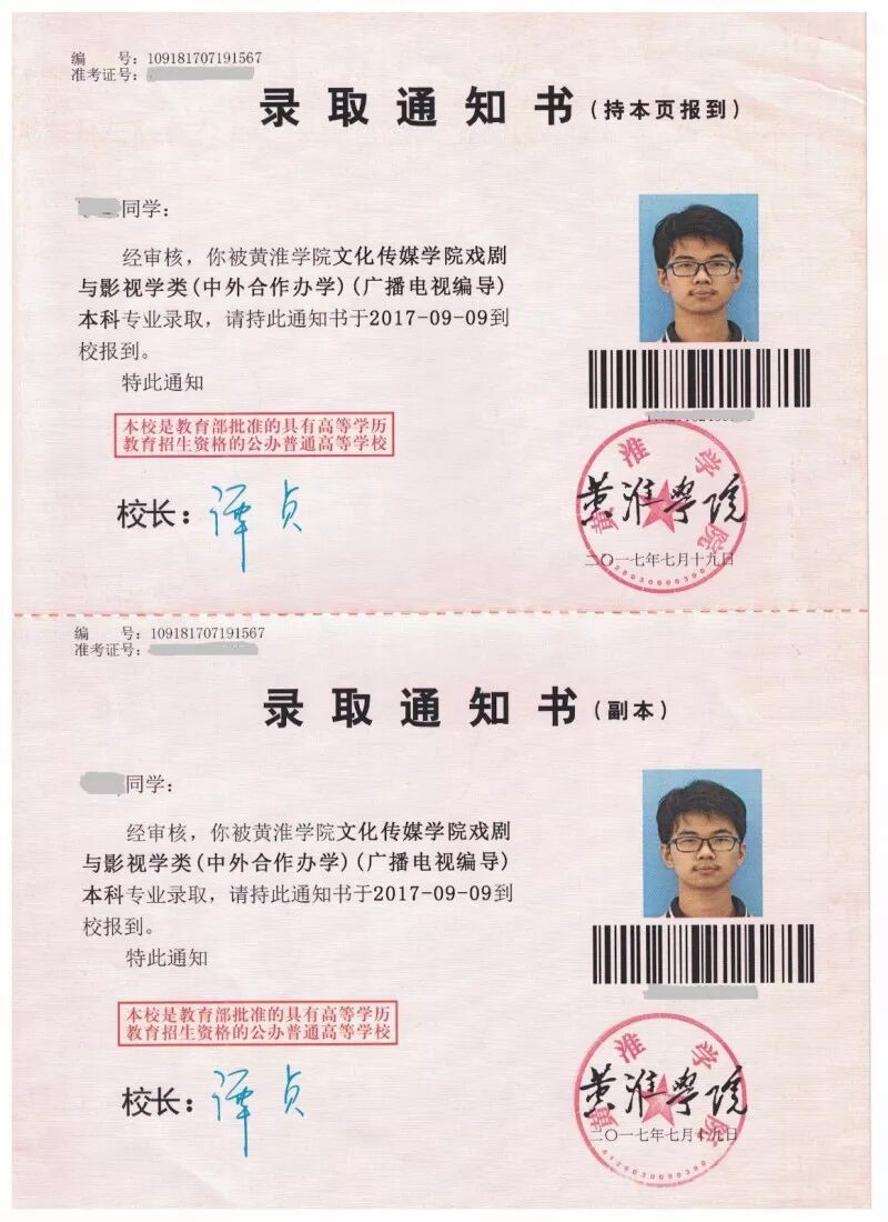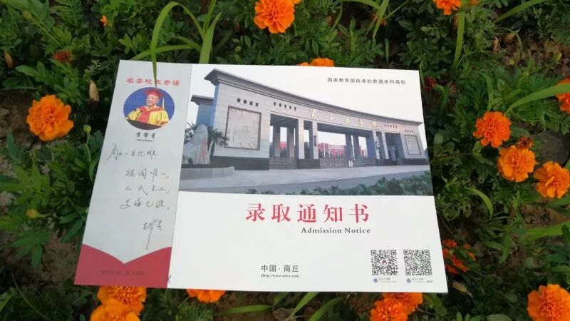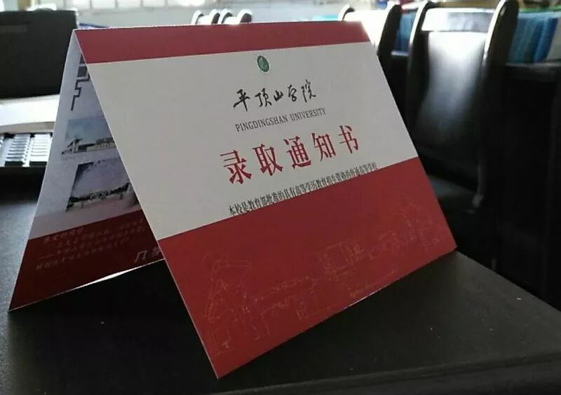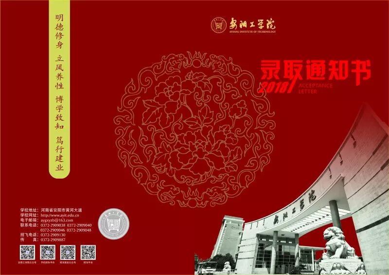 助你飞翔( 高校本专科学生资助政策简介);洛阳理工学院2018级新生入学登记表;高等学校学生及家庭情况调查表;洛阳理工学院2018级新生辅导员带专业情况一览表;致2018级新同学的一封信;大学校园安全常识十八条;大学新生应征入伍(内含:河南省大学生参军入伍七项优待政策);录取通知书;洛阳理工学院2018报到须知。 黄淮学院录取通知书封面以正红色为主基调,大小为:21cm×28cm,长宽比例为6:8,符合美学标准。对折分为录取通知书正本与副本,录取新生持正本报到,副本可留存以作纪念。 封面为简单醒目的“黄淮学院录取通知书”九个大字,配以中国红灯笼以示喜庆祝贺。一行小字“经国家教育部批准、由河南省人民政府主办的公办全日制普通本科高校”简要说明学校性质与办学层次。 封底为黄淮学院校园全景图,展示学校环境与设施。底部小字标明学校地址、招生联系方式、学校网址、迎新电话等,方便新生入学。 平顶山学院录取通知书以红色为主色调,其中黑、白色彩的搭配,使跳跃的红色更加热烈而又喜庆。在设计中大量运用了中国传统纹样形式,并通过极具现代的二维空间分割形式,将传统与现代结合起来,展现出稳重中求发展的平顶山学院办学特色。 录取通知书正面,文字部分采用中轴对称形式,端庄优雅,下部线描手法勾勒出平顶山学院标志性建筑——南大门,既具有了装饰美化作用又在形象上呼应了平顶山学院这一主题;通知书背面平顶山学院校训的隶书字体,其文化远博感与其上部相邻的团花卷草纹样搭配,相得益彰。下部的二维码深度解析了平顶山学院,让学生对这个即将与之朝夕相处的地方有了一个初步印象。 通知书内部分为两部分,一是记录学生信息的录取通知书,二是学生自留的入学纪念卡。通知书部分大面积留白,以便填入录取信息。其中红色色条和灰色边角纹样既起到了区域限制作用,又与纪念卡上的红色色块和边角纹样相呼应;纪念卡部分,上部的平顶山学院标志字体与下部的纪念卡标题上下对照,首尾呼应。中部左右分为两个部分,左面为平顶山学院的标志性建筑,以素描、彩铅的绘画形式展现。右面为文字部分,与下面的校长寄语组合在一起,对新生表示欢迎的同时,也传达了期望之情。 录取通知书封面使用学校大门,突显学校的形象和记忆。 录取通知书封底用了校训,体现学校的办学原则与目标。 独特的防伪LOGO,增强录取通知书的严肃性和权威性。 录取通知书内页,和封面整体采用中国红,凸显喜庆热烈的气氛,以精湛的烫金制作工艺使录取通知书显得更加珍贵和隆重,在细节中展示安阳工学院对每一位新生的关怀和尊重。 拿到录取通知书后,首先进入眼帘的是“郑州师范学院2018录取通知书”,上方是学校的校徽。录取通知书放上了学校标志性教学楼“文汇楼”,象征着人才的汇聚地。录取通知书以红色为主色调,蓝色辅之,下方写着郑州师范学院校风“格物致知,明德尚善”,这意味着从你收到郑州师范学院的录取通知书开始,便要慢慢开始践行“格物致知,明德尚善”的品格。 郑州师范学院录取通知书正面以恢宏的图书馆为底图,上方是郑州师范学院的校名和校徽,下方是郑州师范学院校长孙先科的签名。 我在录取通知书里为你写下30行情书 你知道第一眼看见你是什么感觉吗? 不知道 是心动的感觉 纸短情长 对你的爱 都写在录取通知书里面了 不因你 不为我 只因你我郑科才显得不同 你来 不论多大的风雨 我都准备好去接你 说一万遍我想你 不如一句 在这里等你 三行情书太长 你被录取了 一行就够了 如约而至与不期而遇 皆美好 皆与你相衬 轻翻一本图书 执笔一封情书 邮寄一份录取通知书 一遇见你就忍不住为你obsession 很开心能得到你的permission 诺,这是你的admission 郑小科同学: 经省招办批准,你被我校录取 请持此通知书于8月28日至30日准时到校报到 商丘工学院录取通知书采用简洁大方的设计原理,分为两部分:一部分为录取通知书,一部分为录取纪念卡(可以剪下保存)。通知书正面为商丘工学院大门,背面为录取通知。录取纪念卡正面印有前外交部部长、商丘工学院名誉校长李肇星头像和签名寄语“祖国唯一,人民至上,学海无涯”,背面,学生可以签名后留念。和录取通知书配套的有入学须知、校长寄语、推荐阅读书目、智慧迎新入学报到指南(报名、缴费、选宿舍等)。 郑州电力高等专科学校录取通知书的设计上融入了学校校徽、校训、学风等元素,突出学校85年办学的深厚历史底蕴和浓厚人文气息。 红色的快递形象封,清晰醒目的标注了“郑州电力高等专科学校”字样,并以学校鸟瞰图做背景展现学校全貌。 录取通知书按黄金分割比例压线,新生可将通知书沿压线剪下留作纪念。在录取通知书校名上方印有“严谨笃学,敬业乐群”的八字校训,这是学校对新生健康成长的殷切希望。 录取通知书报到凭证一栏印有新生姓名、照片、录取专业等信息。报到凭证背面以传统中国结元素为边框,内容是新生入学报到注册单和“立德修能,知行合一”的学风字样,彰显了学校典雅端庄的人文气质。 郑州澍青医学高等专科学校的录取通知书以绿色为主色调,以澍青校徽为背景图案,秉承简约、实用的原则进行设计和印刷。 学校创建于1984年,校徽犹如雨露滋润的禾苖,又如翻开的书本,还似亭亭玉立的塔松,象征着青年在润