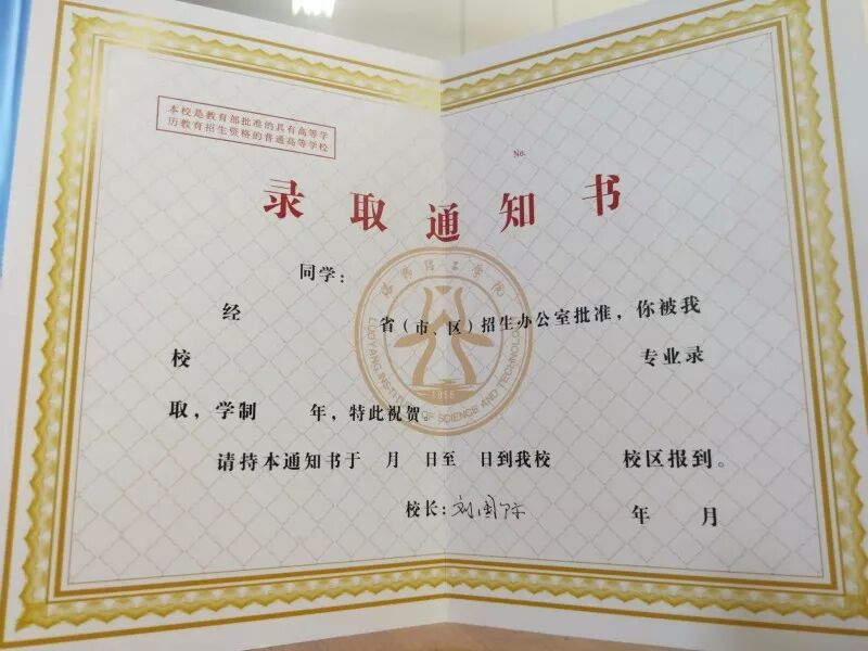 其次,“归德”也指“旨归在德”,即教育之最终目标在于提升人的素质、完善自我与他人之人格。 智圆行方:语出《文子.微明》,“ 老子曰:凡人之道,心欲小,志欲大;智欲圆,行欲方……智圆者,无不知也;行方者,有不为也。”形容知识要广博周备,行事要方正不苟,有雄才大志又品正方行实现德与才的结合。 洛阳理工学院录取通知书,外包装封面图是以大红色为基础色调,金黄色的校徽和“洛陽理工学院”(包括小号英文),“录取通知书”,并放置二维码以及洛阳理工学院古朴典雅的开元校区南门的照片所构成。 内页录取通知书封面图以红色为基础色调,金黄色的洛阳理工学院王城校区鸟瞰图为背景,金黄色的校徽和“洛陽理工学院”(包括小号英文),以及”2018录取通知书(包括小号英文)“几个大字组成,通知书内页以校徽为背景,红色“录取通知书”下方是以白底黑字表明某同学经何省招办批准被哪一专业录取,学制几年以及校长签名和年月。 通知书信封内部共包括十样东西,即: