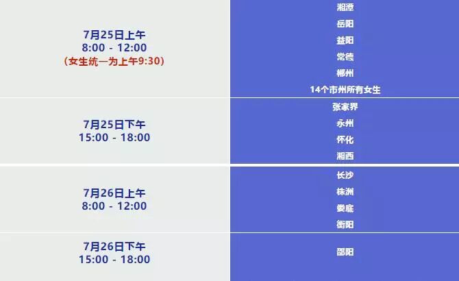 面试时间 7月25日 — 7月26日 面试地点 长沙航空职业技术学院圭塘校区体育馆(长沙市雨花区体院路348号) 面试具体安排 女生注意:所有参加定向培养士官的女生面试时间为7月25日上午 面试方法 面试人员由招收部队和招生院校相关工作人员组成,主要通过目测和交谈,依据《定向培养士官招生面试表》进行评价,给出合格或不合格结论,并及时通知考生。 面试内容 考生须自我介绍,面试官通过目测和交谈,包括报考动机、心里素质、语言表达、逻辑思维、形象气质、反应能力。 (面试结果当场就能知晓,如果不合格,面试官会说明不合格的原因。) 注意事项 1.考生务必提前半小时到达面试现场。 2.参加面试的考生须携带本人身份证、准考证和1张1寸红底正面免冠照片。(有其他获奖证书或等级证书的一并携带) 3.所有参加面试的考生必须按指定时间到达面试场地,未按时到达的考生视为自动放弃。 4.面试结束后,考生自行离开。 5.考生食宿自理。