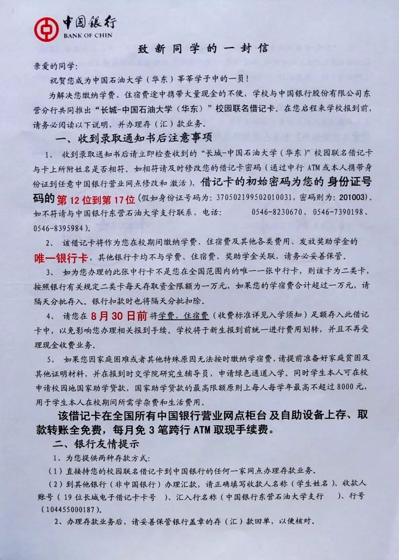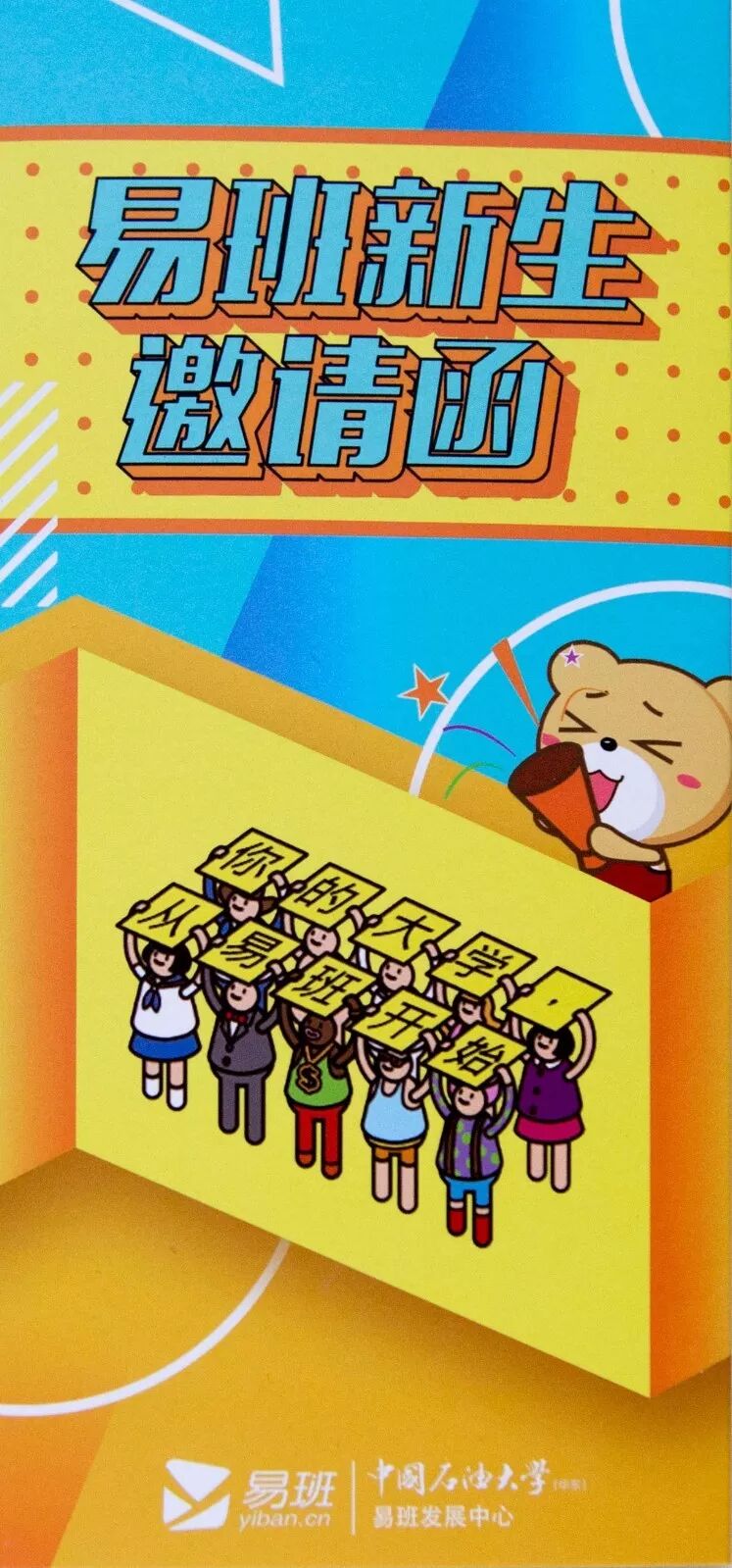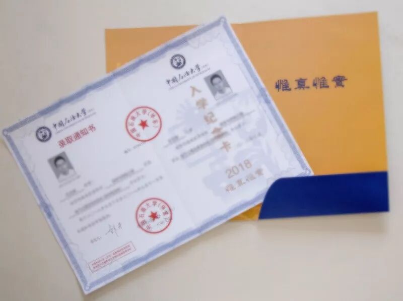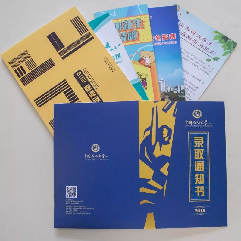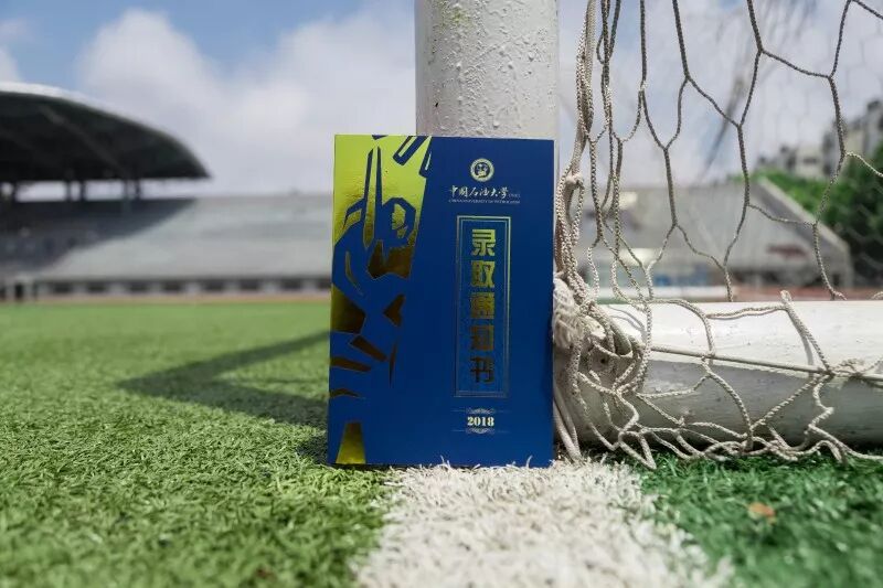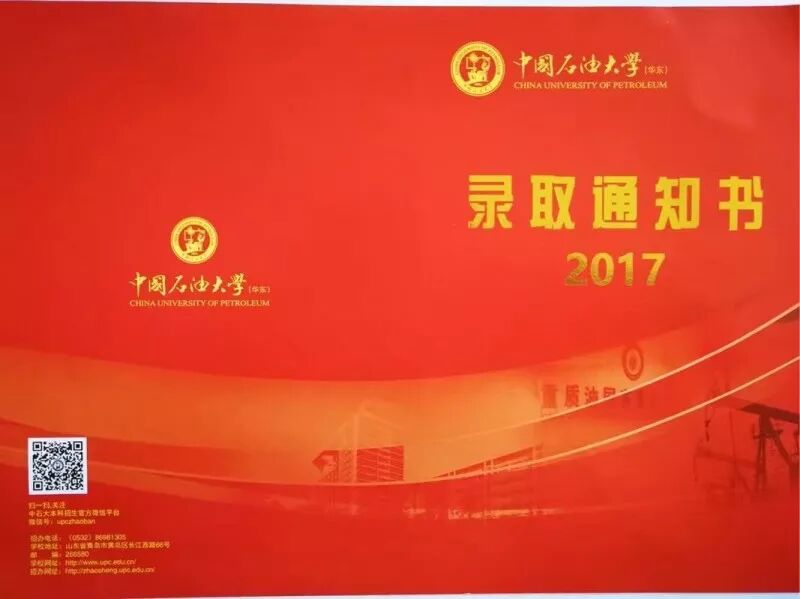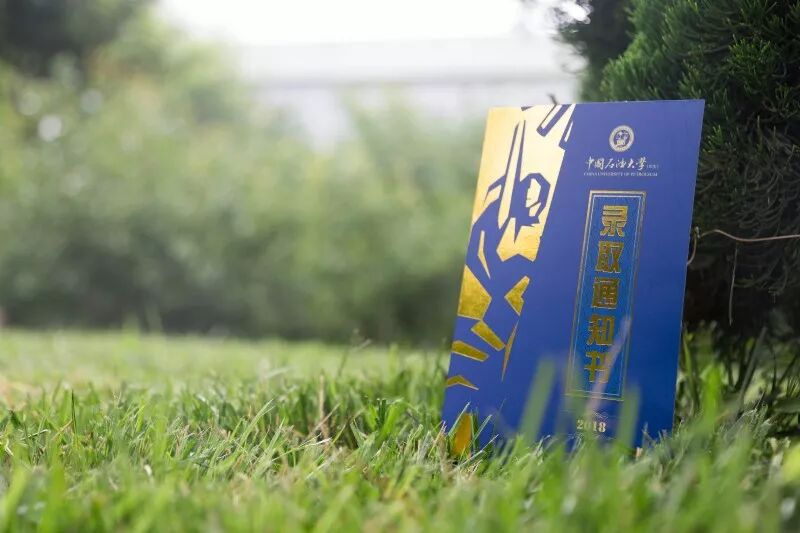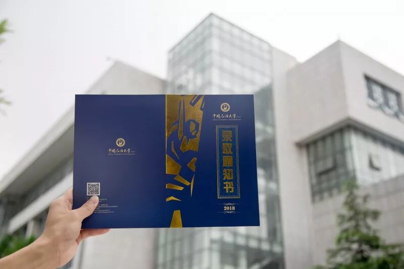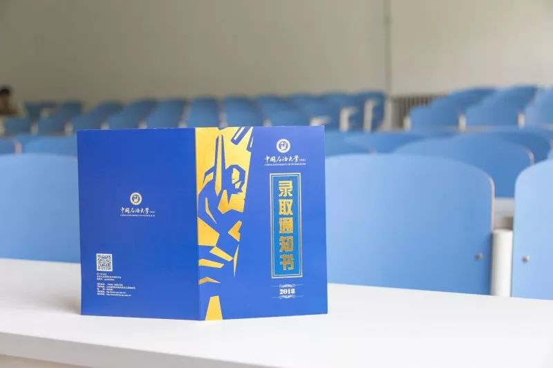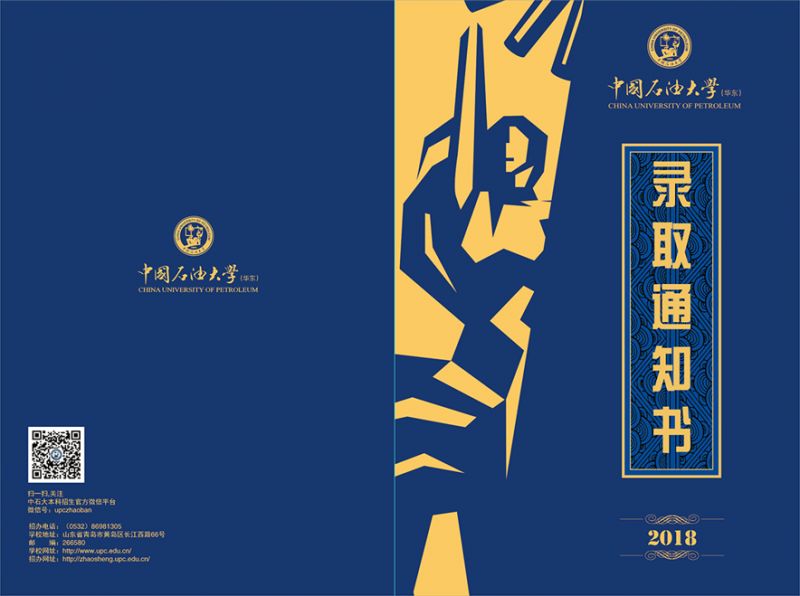 录取通知书采用了封套加内页的设计形式,方便同学们的保存,也使通知书更具收藏和纪念意义,希望成为新生值得珍藏一生的回忆。 封套设计整体以蓝色搭配金色,寓意”青出于蓝而胜于蓝”,主色采取与校徽颜色统一的深蓝色。校徽、中英文校名、“创造太阳”剪影及“录取通知书”几个大字采用“烫印压金”工艺嵌入封面,象征着“金榜题名”,同时也表现出石大深厚的学术底蕴和辉煌的历史。 “录取通知书”几个字的背景衬托以海水江崖纹,寓意石油大学紧随世界潮流脚步、走向国际化,同时凸显了石油大学所处的地域优势。 封套内页以明亮的黄色为基调,是祝贺的色彩和隆重的邀请。封套内页左侧印有学校标志性雕塑“创造太阳”。右侧“惟真惟实”的校训映入眼帘,是石大精神的集中体现。 录取通知书内页设计整体简洁雅致,运用海浪花边、校徽底纹、如意纹等传统吉祥图案元素丰富画面层次。边框使用英文“UPC”的四方连续回纹抽象图形。体现石大人“实事求是、艰苦奋斗”的校风和“求真务实、创新图强”的精神。 通知书♡树林 通知书♡操场 通知书♡教室 通知书♡南教楼 通知书♡图书馆 新设计的录取通知书,真的是美极了,这也代表了石大对18级Upcers的欢迎。对了,除录取通知书之外,18级小可爱还会收到很多东西哦。