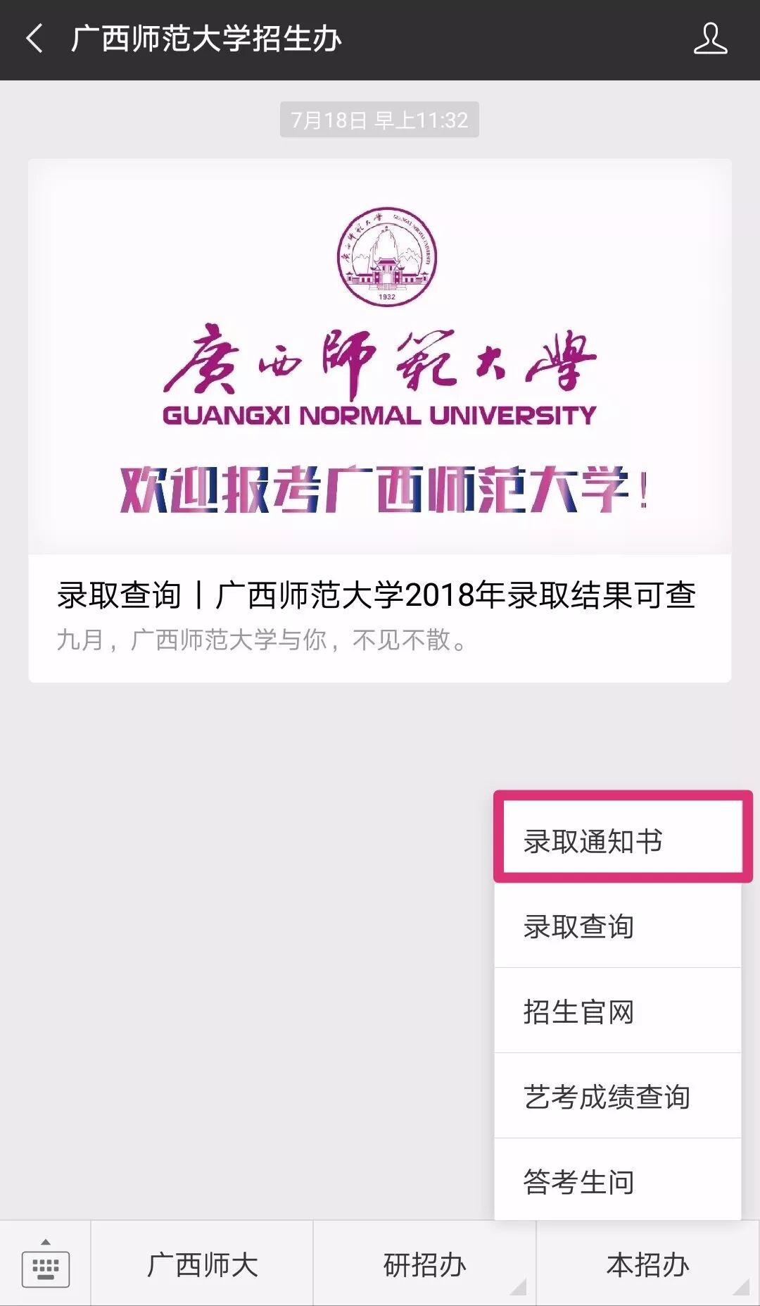 方法二:关注广西师范大学招生办公室微信公众号,点击右下角的子菜单“录取通知书”便可查询EMS单号;