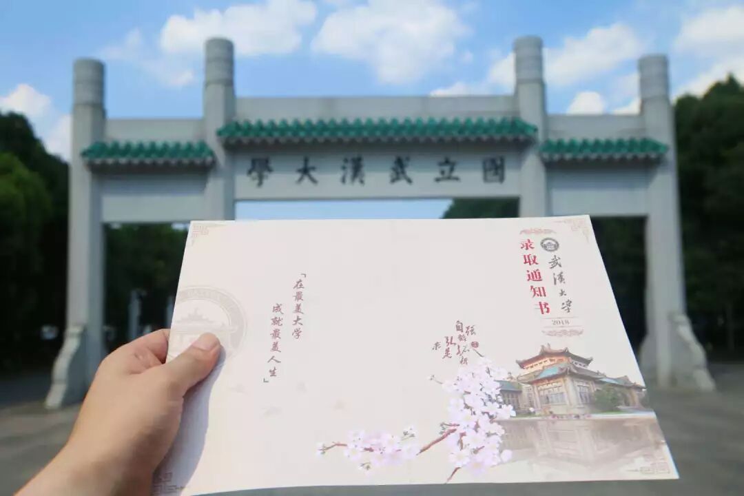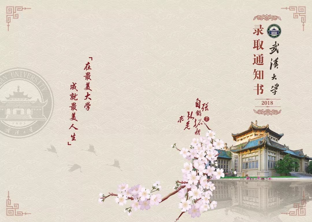 校训下面的樱花是武大代表性的植物,每年春暖花开,便是武大最美的时节;黄鹤,一种祥鸟,其故乡是武汉,通知书上的黄鹤代表莘莘学子,希望同学们能在最美大学,成就最美人生。