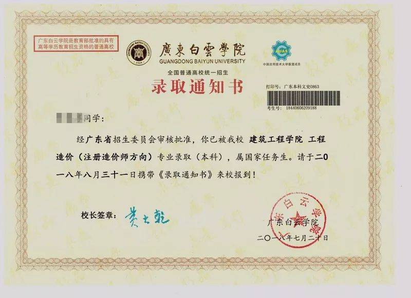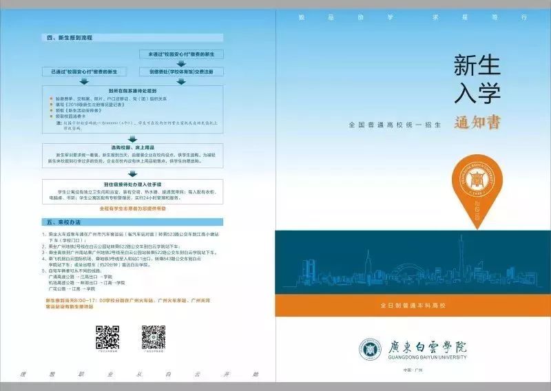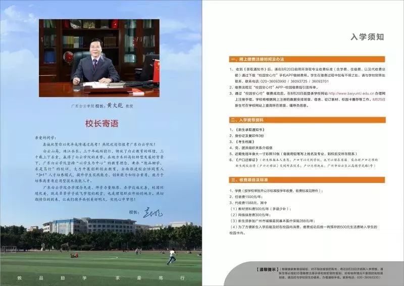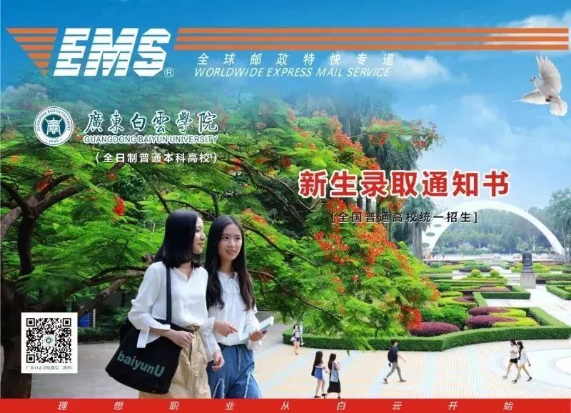 校企合作”,构建校企协同育人人才培养模式,提升学生实践能力、创新能力和综合素质,致力于培养高素质应用型技术技能人才。 广东白云学院办学理念先进,师资力量雄厚,办学设施完善,校园环境优美,是莘莘学子放飞梦想的地方,是理想职业开始的地方。我们18000多名师生热切期盼您的到来,让我们携手共创美好明天,实现心中梦想! 1、《新生入学通知书》 2、2018年新生收费项目及标准 3、官方收费平台(校园安心付) 4、致高校青年学生的一封公开信 5、大学新生应征入伍宣传单 6、《2018-2019学年生源地信用助学贷款政策解析和流程详解》 7、家庭经济困难学生认定申请表 8、国家资助政策简介 9、校服价格表 10、生活用品订购单 温馨提示 快递单号可通过官网或官微菜单栏“2018录取查询入口”查询。
