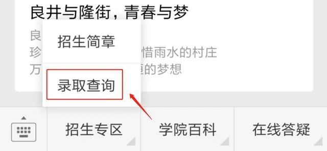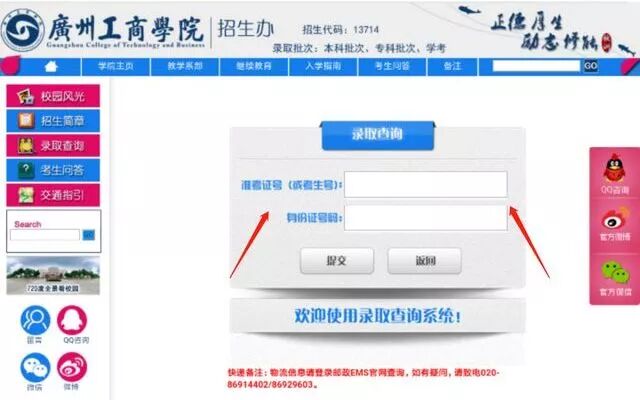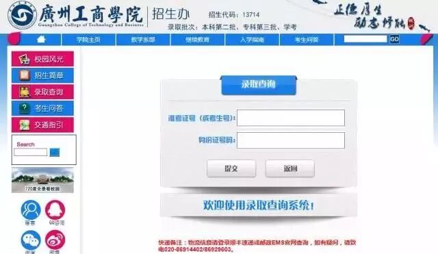 征集志愿投档查询方式 一、官方微信查询 关注“广州工商学院招生办”微信公众号 01 点击:招生专区 02 点击:录取查询 03 输入身份证号或准考证号即可查询 二、广州工商学院招生办官网查询 01 登录招生官网:http://www.gzgs.org.cn/ 02 点击:招生就业——招生信息 03 点击:录取查询 04 输入身份证号或准考证号即可查询