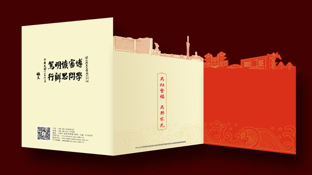 充满喜庆的红色封面之上,采用寓意光荣和辉煌的烫金工艺,将中山大学古文字学教授陈炜湛先生亲笔所书的“录取通知书”五字嵌入其中,古朴的篆体彰显了国父手创的百年名校所独具的历史沉淀。