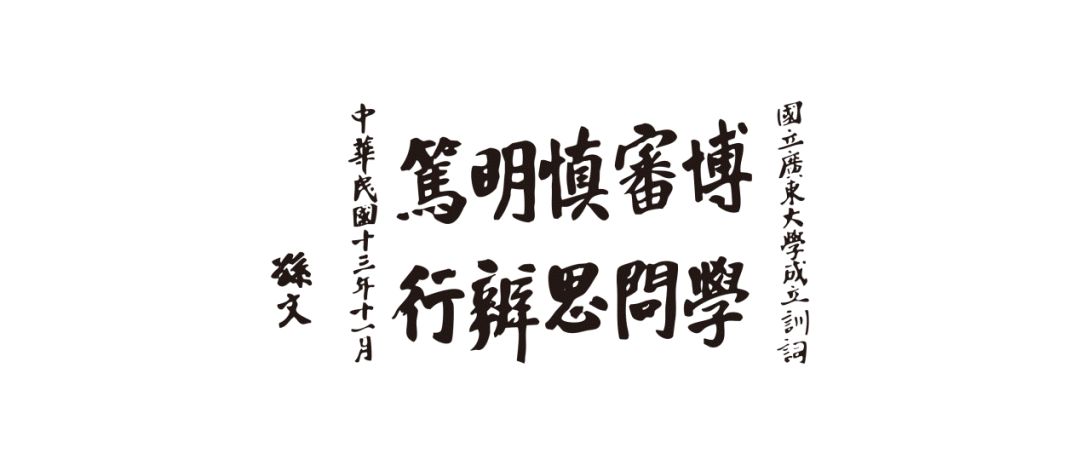 右开页的背面印有的“博学、审问、慎思、明辨、笃行”是孙中山先生于1924年11月11日在广东大学举行成立典礼时亲笔提写的,出自《礼记•中庸》的这十字校训,要求至诚以修身,通过学、问、思、辨、行,自我修养成“君子”。这是中山先生对每一届中大学子的“开学寄语”,亦是中大学子理想的求学与为人之道。
