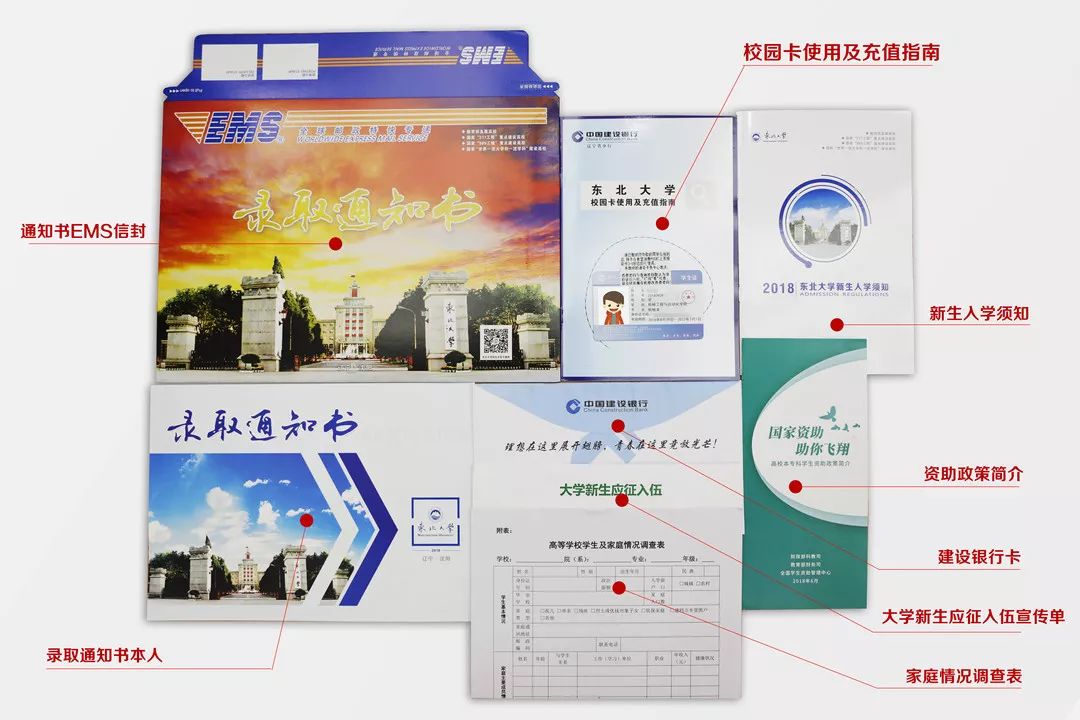 录取通知书材料袋中除了通知书大家比较关注之外,袋内材料还包括:新生入学须知、学生证一卡通及使用指南、银行卡、资助政策简介、家庭情况调查表、大学新生应征入伍宣传单。