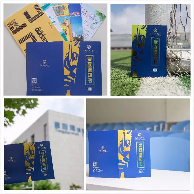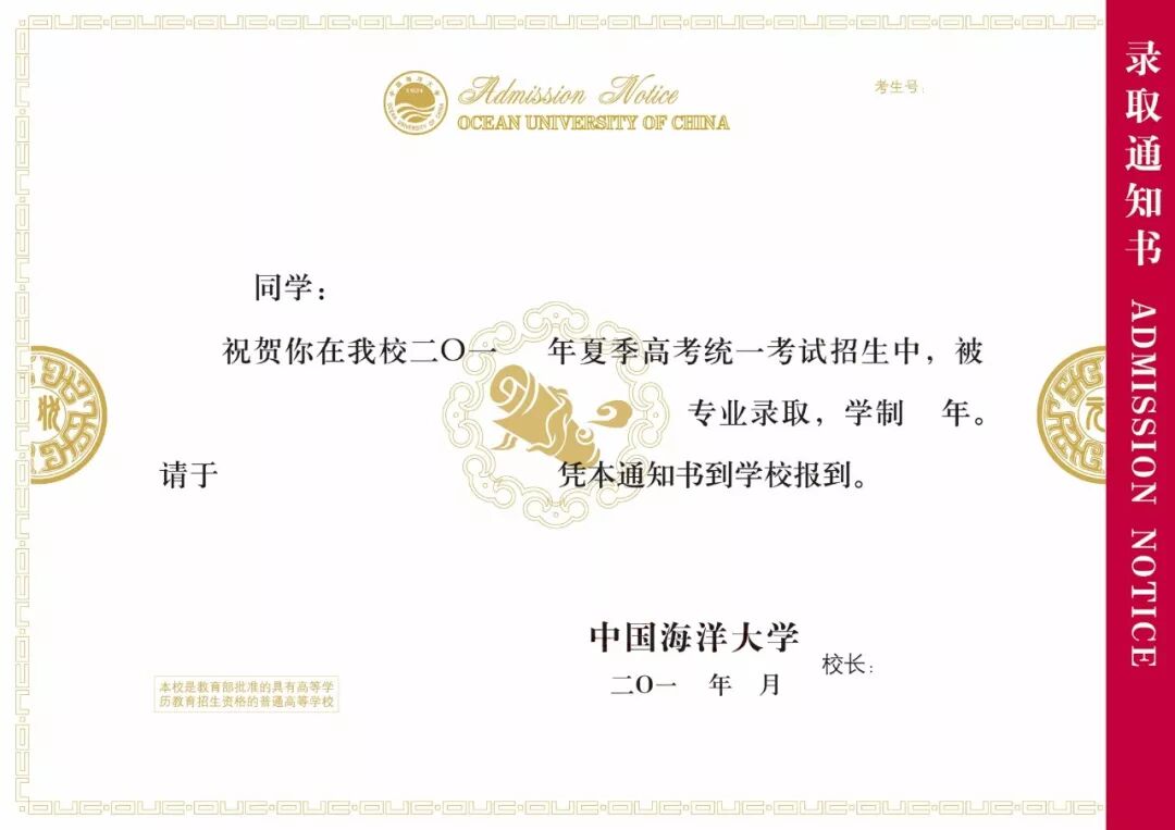 中国海洋大学录取通知书封面图案是具有海大特色的鱼山校区校门和六二楼,使用石板画线条形式表现,体现出海大建校九十余年的历史积淀和深厚文化;设计简洁大方,颜色使用金、玫瑰红、黑,纸张使用进口金焕系列特种纸,整体风格庄重典雅。 录取通知书中英文使用大宋体,用竖式玫瑰红色条反金黄字放在画面右侧,通知书折起或展开时都可以呈现录取通知书中英文,画面设计有“喜报”“状元”图形,突出体现了录取通知书的设计定位。内芯边框线巧妙地把中国海洋大学校名英文缩写“OUC”融合设计当中,与海大“毕业证书”“学位证书”既有联系又有区别,彼此相呼应,具有纪念珍藏价值。