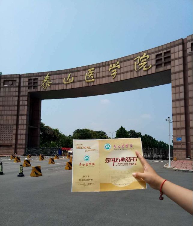 泰山医学院录取通知书形式按照对折页设计,上有泰山医学院校徽和中英文校名组合,组合下面是红色喜庆效果的2018入学通知书中英文设计组合,正面底部是泰山医学院校本部东大门照片;