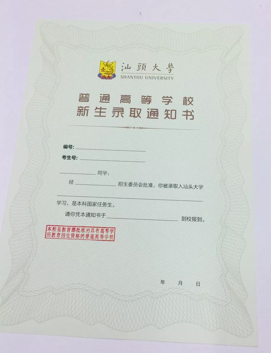 广东省的新生录取通知书已寄出。 其他省份在7月30日可查询。 ——汕头大学招生办 揭开“信封”真面目 ★ 录取通知书信封内容 ★ · 汕头大学录取通知书 · 新生入学报到注意事项 · 新生校园网账号 · 银行卡 · 奖助学相关宣传单 · 征兵工作宣传单 · 移动校园卡 汕头大学,待你到来 报到时间: 9月3日! 9月3日! 9月3日! (重要的事情说三遍!) 需要提前预定飞机票、动车票的小伙伴们注意时间哦! 报到地点: 汕头大学体育园(STU sports park) 交通途径: 飞机(揭阳机场) 动车(潮汕站) 汽车(汕头汽车客运中心站、汕头汽车总站、汕头中旅) 专设立新生接待站 汕头火车站出站口(含汽车客运中心站)、 汕头汽车总站、 厦深铁路潮汕站 均有汕大专设的新生入学报到接待站,为小鲜肉们的到来一路护航! · 新生自行到学校 火车、汽车 火车站、客运中心站(泰山路) 请乘坐6路公交车 中旅站、华侨大厦站 请乘坐39路公交车 汽车总站(潮汕路) 请乘坐17、39路公交车 动车 北出站口公交站 请乘坐181B路公交车 北出站口公交站 汕头东线高速直达专线班车到达客运中心站(泰山路)转乘公交车 北出站口公交站 汕头西线高速直达专线班车中旅站(汕樟路)或汽车总站(潮汕路)转乘公交车