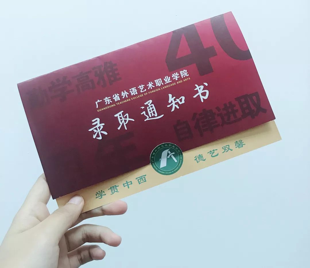 广东省外语艺术职业学院 2018级新生录取通知书 九月 - 开学季 从此 父母只剩背影 故乡只有夏冬 那些挑灯夜读的日子,那些嬉笑打闹一起走过的时光,都成了你心底最大的慰藉。恭喜你坚持努力地走过了那些年,即将成为广外艺校园的新成员。 接下来,请你以饱满的热情,十足的自信来面对人生新的一段旅程,昂起胸膛,面带微笑,大步流星地往前走。 2018级的萌新们 你们的录取通知书来啦!~ 被统一打包好的录取通知书 老师同学们在进行通知书寄送的封装和核对工作中 经过广东省外语艺术职业学院招生办公室的老师及同学们的努力,2018级新生第一批录取通知书,已在2018年7月25日前,通过中国邮政特快邮件,邮寄到每一位“外艺新主人”手中。此次发放的通知书,包含自主招生,依学考录取,三二分段,五年一贯制(全省统考)的招生类型。想要提前了解邮件里都有什么吗?小编现在一一告诉你! 广外艺录取通知书邮件中包含 1:40周年校庆版录取通知书 2:2018级新生入学指南 3:高校本专科学生资助政策简介 4:全国学生资助管理中心致新生一封信 5:大学新生应征入伍宣传单