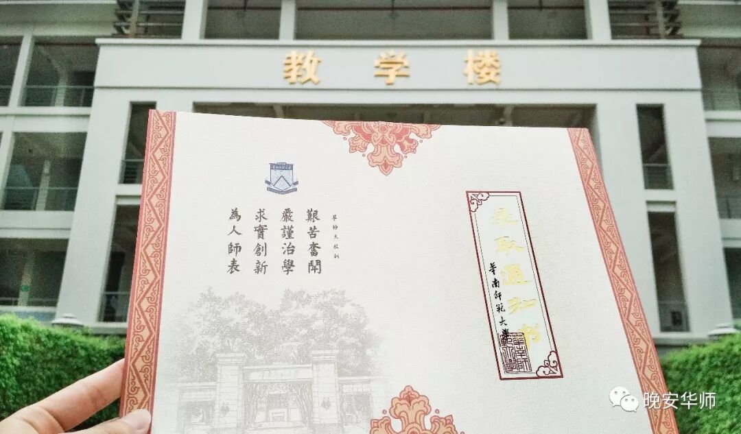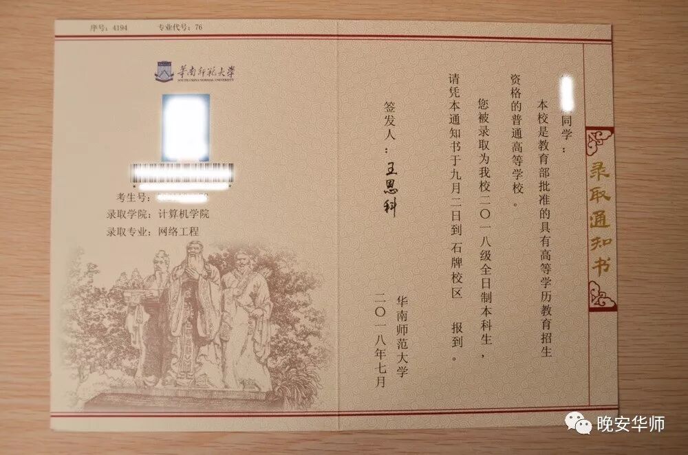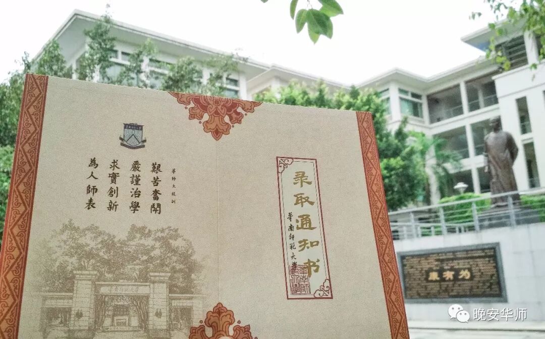 另外,在录取通知书外页左侧印有华南师范大学校训“艰苦奋斗、严谨治学、求实创新、为人师表”,下方是华师正门的手绘稿。我们希望,从给新生的第一份礼物——录取通知书开始,让华师的校训潜移默化地影响一代代华师人。