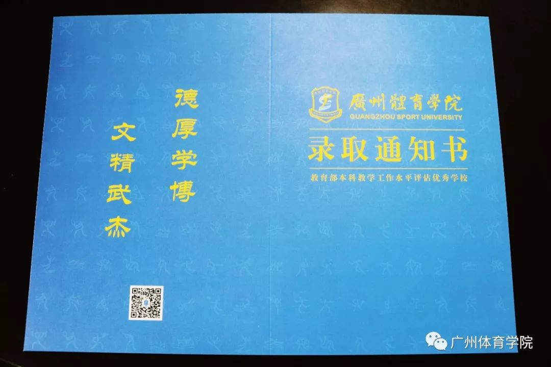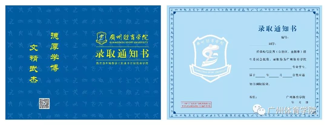 内页的通知书则以蓝色为基调,正封深蓝,里页湖蓝色。广州体育学院作为华南地区唯一一所体育本科高等学府,蓝色是我们学校的基本色,代表着体育院校运动的活力,宛如蓝色的天空般不计较名利,又似深蓝的海洋般充满力量。