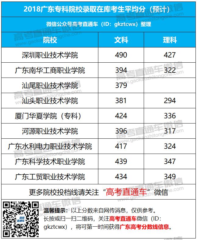 1、专科热门院校分数线预计会大涨,部分院校文科或直逼500分!2017广东本科录取分数线文科418,理科360。但像省内深职、深信职、顺职、广轻这类院校,2017年高考文科投档线都在450分以上,比本科线高出将近40分。2018年,这类院校分数线估计只涨不跌。
