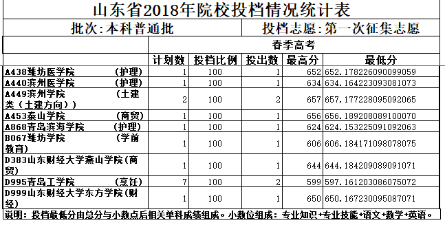 山东省2018年春季高考本科第一次征集志愿投档情况统计表