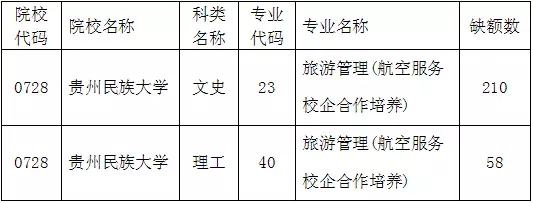 附:贵州民族大学旅游管理(航空服务校企合作培养)专业缺额数统计表