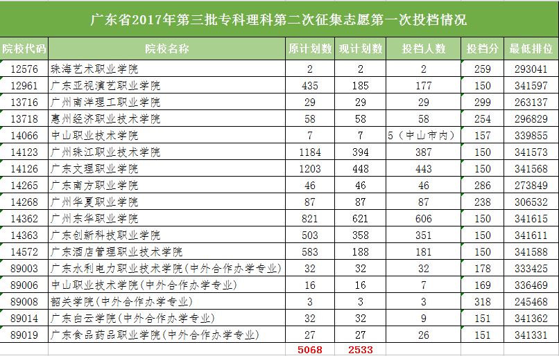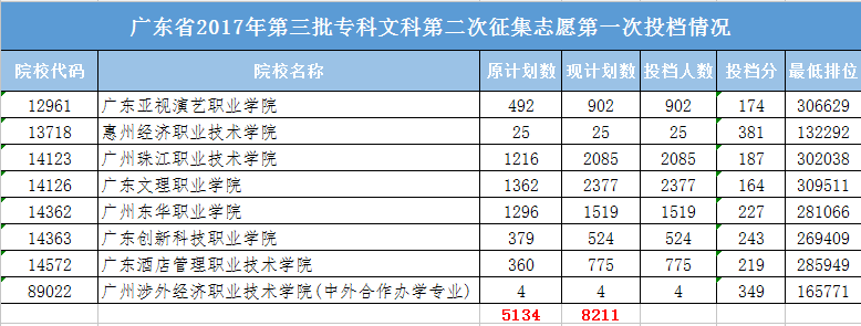 从2017年专科以文科补录数据能看出,很多院校即使进行了补录,仍然招不满人。以文科补录为例:广州东华职业学院计划共招3052人,实际投档只有1755人,还缺1297人;广州珠江职业技术学院计划共招2136人,实际投档只有1217人,还缺919人;广东文理职业学院2192人,实际投档只有1029人,还缺1163人。