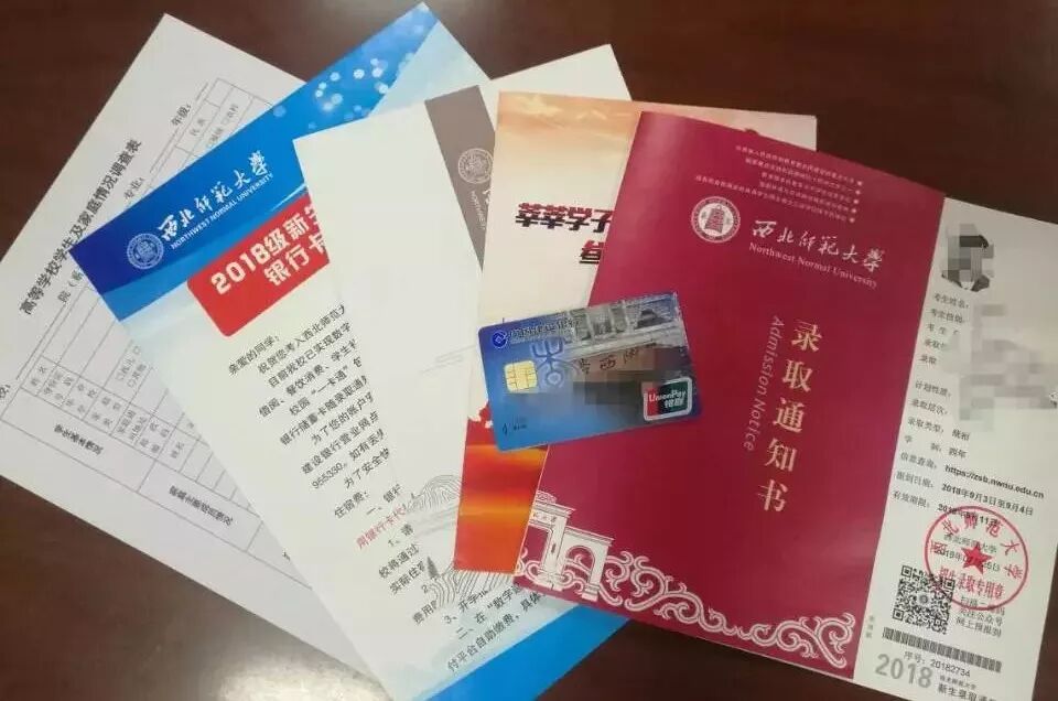 西北师范大学录取通知书包含以下材料: 1.录取通知书 2.新生报到须知 3.学生家庭情况调查表 4.中国建设银行储蓄卡 5.高校学生资助政策简介 6.缴费须知及银行卡使用说明 7.大学新生应征入伍宣传单 我校没有委托任何机构或个人办理电话卡业务。校园卡在注册学籍之后学校统一办理。通知书由EMS寄发,我校已支付邮费,学生领取通知书不收取任何费用。 通知书动态 甘肃C段、D段、T段、U段、G段,安徽艺术,福建普通文理,广西艺术,河北艺术,河南艺术,江西艺术以及普通一批,内蒙古舞蹈,青海体育单招,山东艺术,陕西艺术以及体育,天津普通文理,浙江体育单招。 快递查询 登录西北师范大学本科招生网