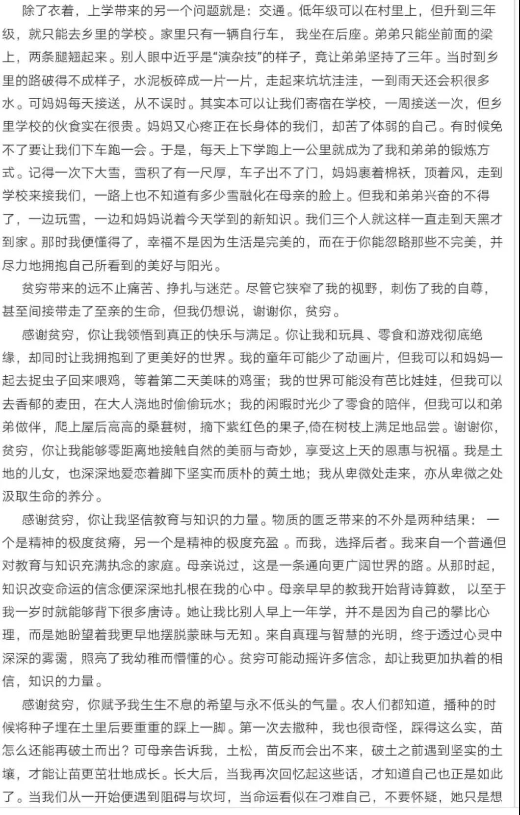 “贫穷带来的远不止痛苦、挣扎与迷茫。尽管它狭窄了我的视野,刺伤了我的自尊,甚至间接带走了至亲的生命,但我仍想说,谢谢你,贫穷。”