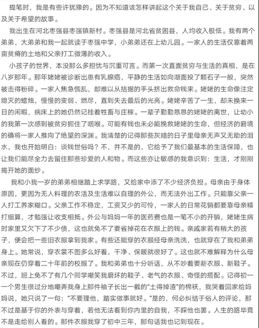 王心仪此前写的一篇关于自己、关于贫穷、关于希望的文章,一经发出以后感动了许多网友。