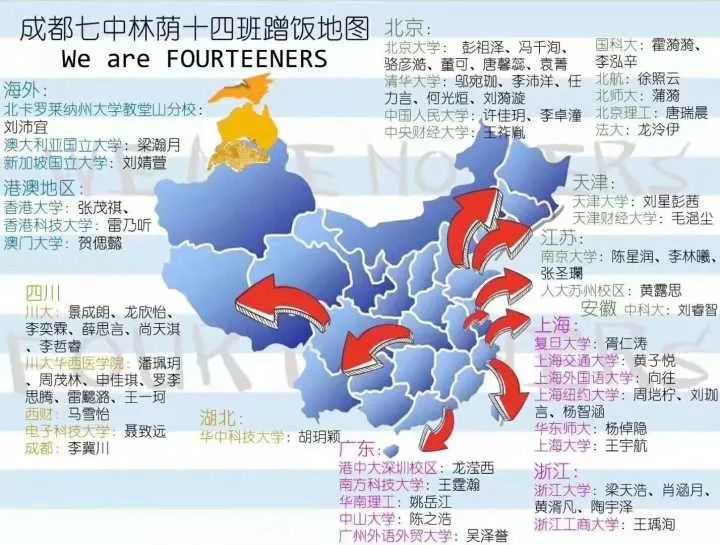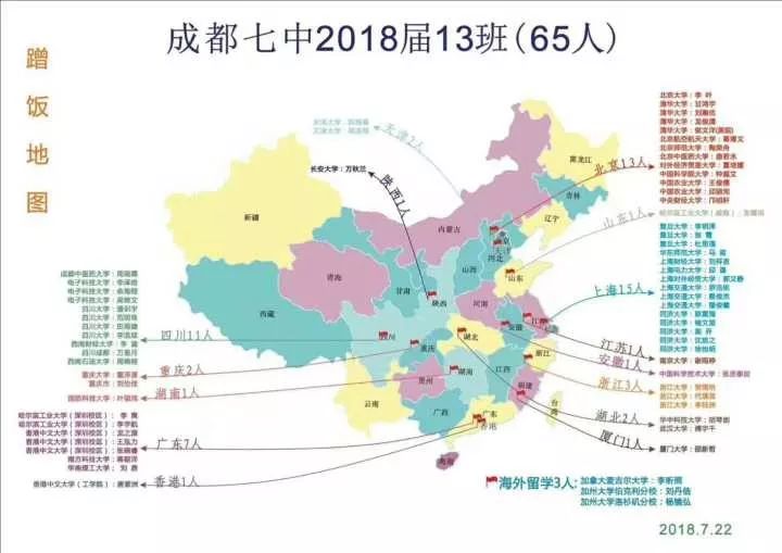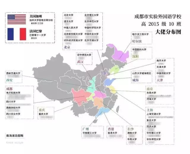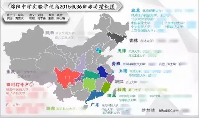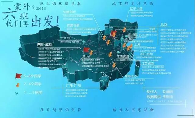 在这张地图上,清楚标明了四川各高中毕业生们的大学去向,尽管即将天各一方,准大学生们仍然可以凭借这张地图走向,继续老同学间的“友谊深造”。据说,这些地图都是由各校学生自制而成,也是十分走心了。