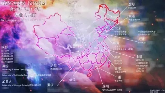 12班是石室文庙的四个实验班之一,全班46名毕业生,遍布3个国家,19座城市!其中人数最多的是川大,有5人。世界这么大,还是家里好!