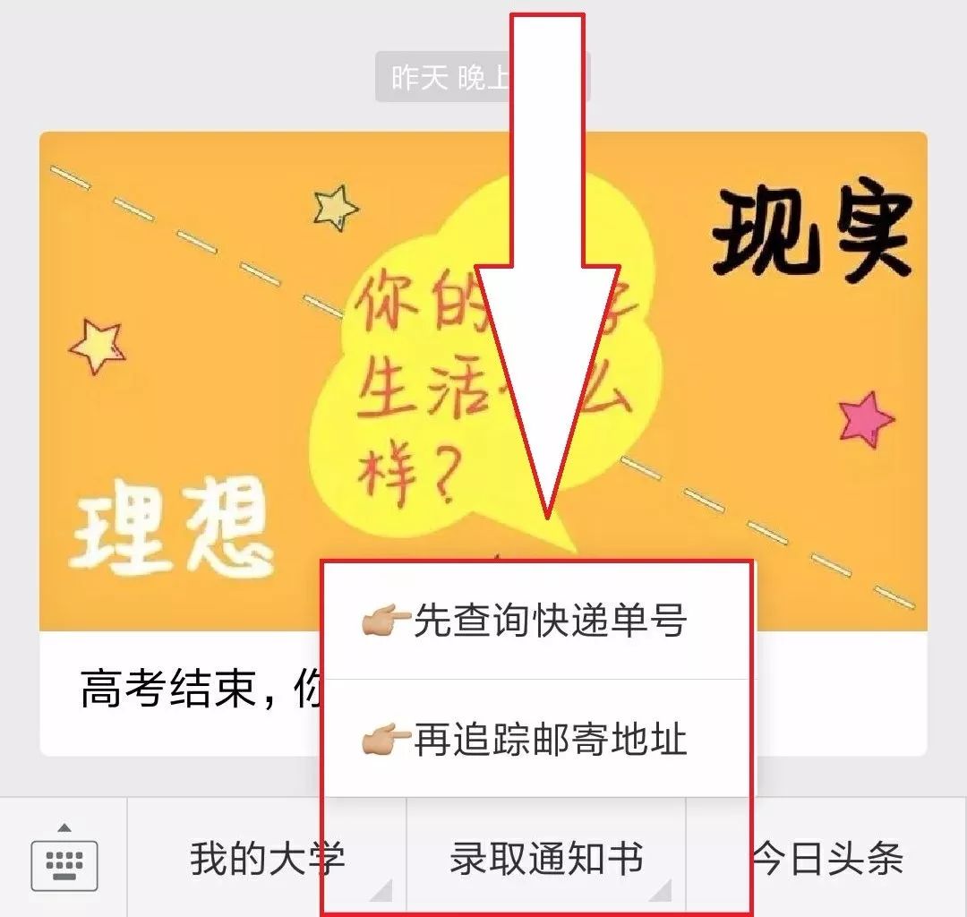 1.进入聊城大学2018年普通高考录取结果查询址:http://wap.lcu.edu.cn/admissionquery/index.jsp录取页面有EMS邮件号(快递单号)。查询到邮件号(快递单号)后,复制,到EMS官网上或EMS微信公众号输入邮件号(快递单号),就可以追踪到邮递信息啦。EMS邮件查询地址: