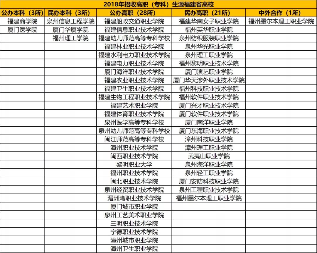 福建省2018年招收高职(专科)生源福建省高校