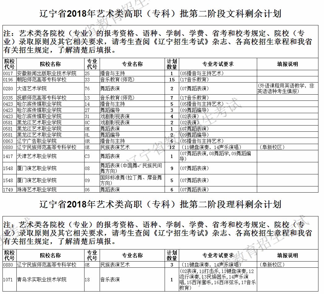 辽宁省2018年艺术类高职(专科)批第二阶段剩余计划