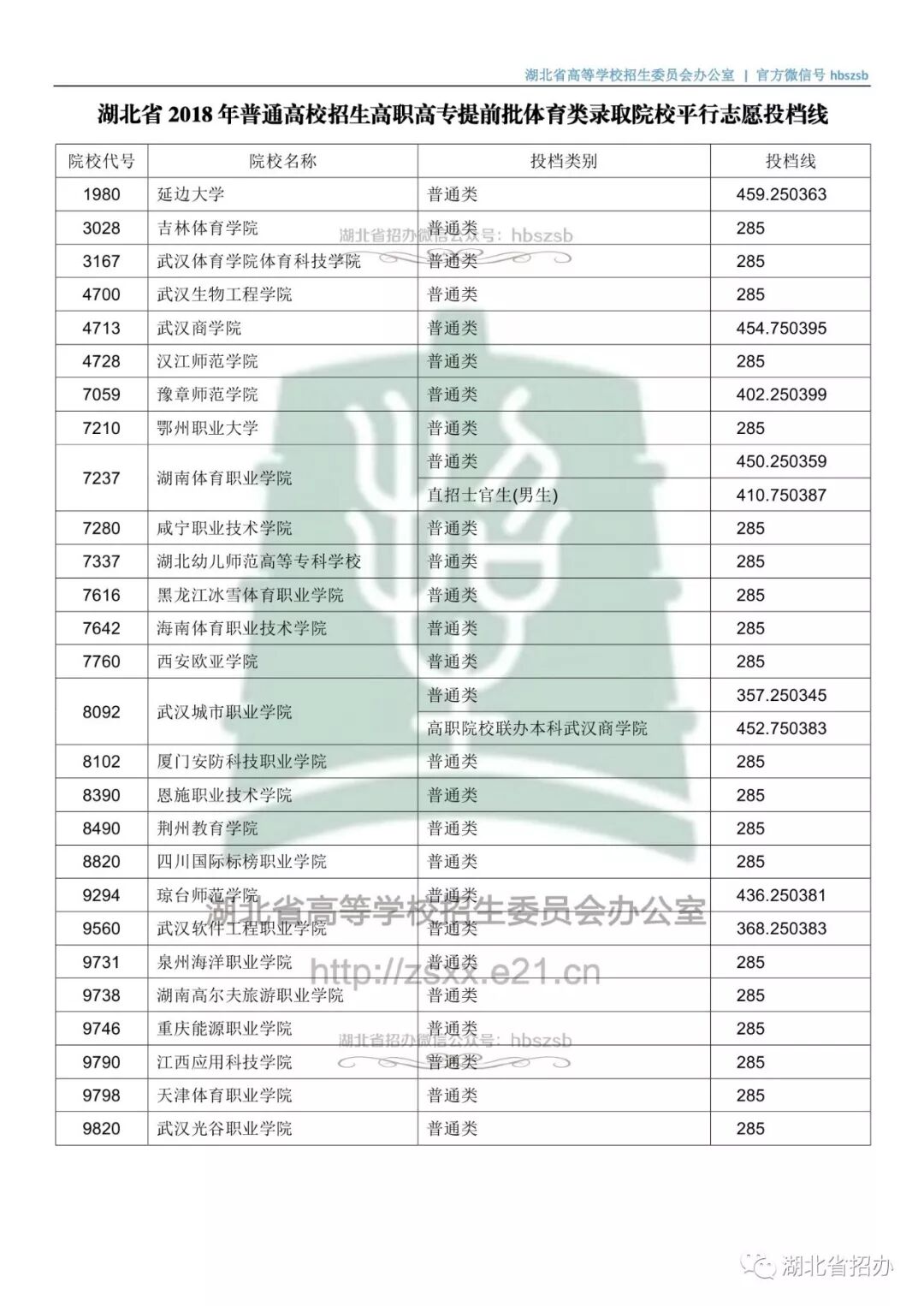 湖北省2018年普通高校招生高职高专提前批体育类录取院校平行志愿投档线