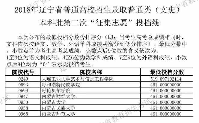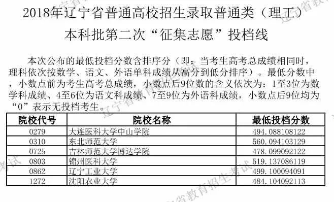 2018年辽宁省普通高校招生录取普通类本科批第二次“征集志愿”投档线