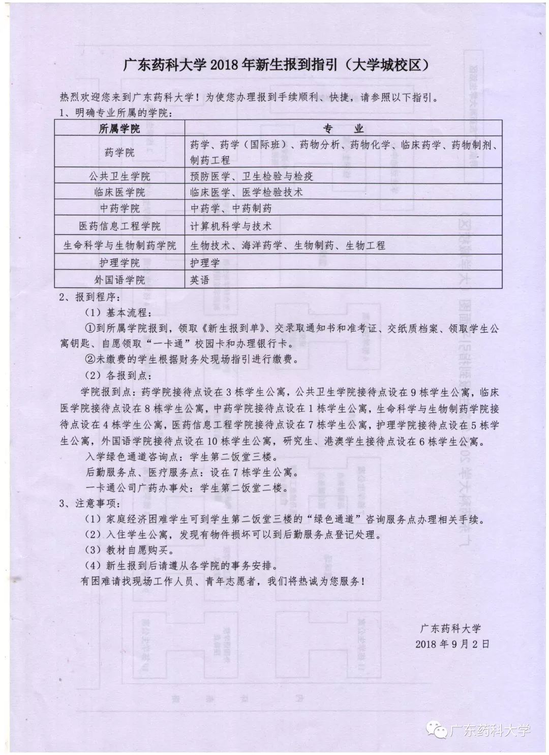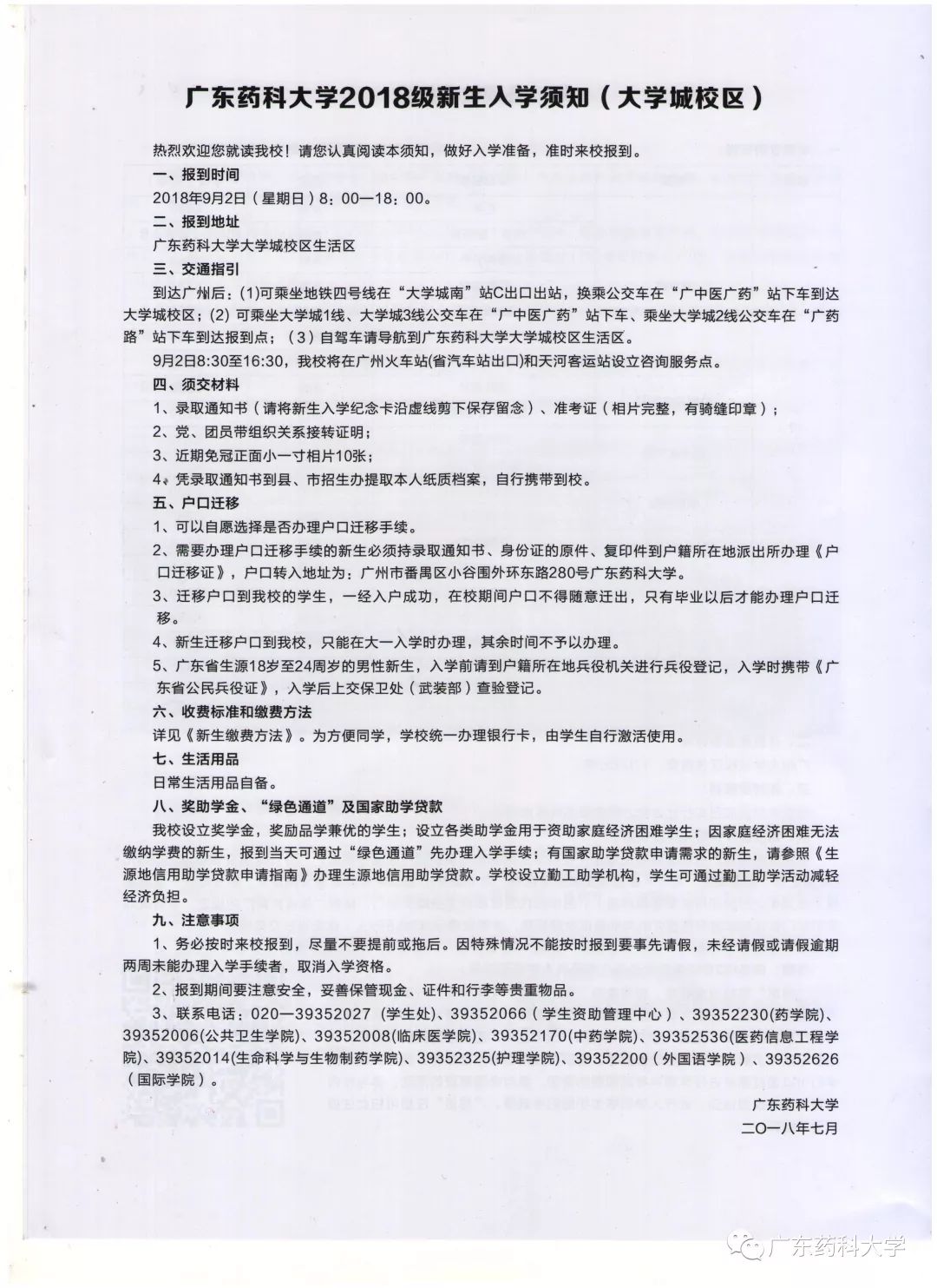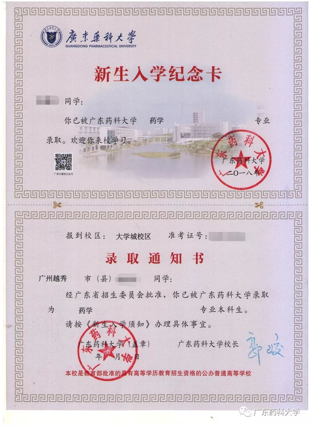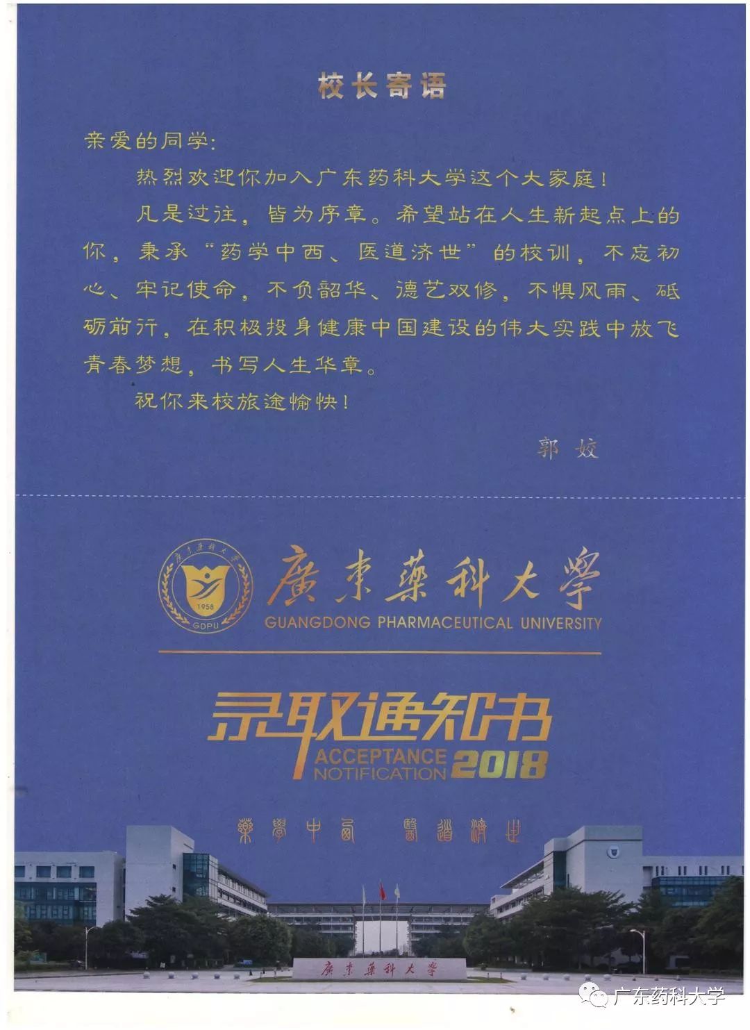 快来看看你的录取通知书长什么样? 校长寄语 亲爱的同学: 热烈欢迎你加入广东药科大学这个大家庭! 凡是过往,皆为序章。希望站在人生新起点上的你,秉承“药学中西、医道济世”的校训,不忘初心、牢记使命,不负韶华、德艺双修,不惧风雨、砥砺前行,在建设健康中国的伟大实践中放飞青春梦想,书写人生华章。 祝你来校旅途愉快! 校长:郭姣 除了录取通知书,你还将收到——广东药科大学2018级新生入学须知 广东药科大学2018年新生报到指引 代收费凭证(农行、中行) 高校本专科学生资助政策简介 生源地信用助学贷款申请指南 广东省家庭经济困难学生认定申请表 (正面) (反面) 2018级家庭经济困难认定及助学贷款办理须知 (正面) (反面) 广东药科大学学生医疗保险工作指引 (正面) (反面) 高校新生应征入伍宣传单 (正面) (反面) 新生大学城一卡通(校园卡)使用指南 致广州大学城高校新生的一封信(只限大学城校区新生) (正面) (反面) 最后,小编为你送上温馨提示: 有关新生注册及报到的所有信息请以广药大官方网站或官方微信发布的消息为准,切勿轻易相信一切冒充广药大的不明来电或不明信息!