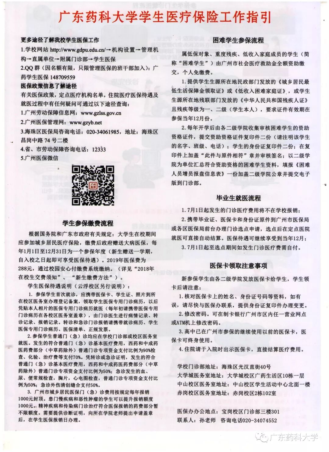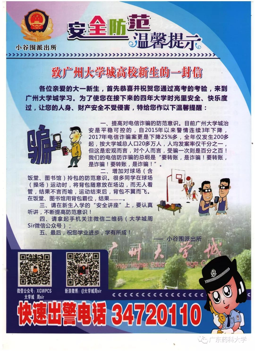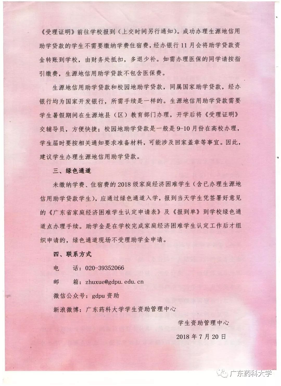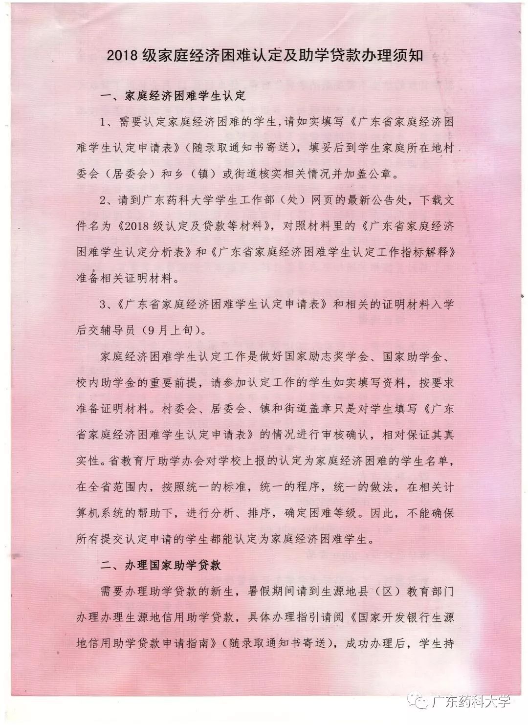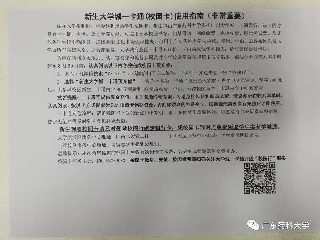 快来看看你的录取通知书长什么样? 校长寄语 亲爱的同学: 热烈欢迎你加入广东药科大学这个大家庭! 凡是过往,皆为序章。希望站在人生新起点上的你,秉承“药学中西、医道济世”的校训,不忘初心、牢记使命,不负韶华、德艺双修,不惧风雨、砥砺前行,在建设健康中国的伟大实践中放飞青春梦想,书写人生华章。 祝你来校旅途愉快! 校长:郭姣 除了录取通知书,你还将收到——广东药科大学2018级新生入学须知 广东药科大学2018年新生报到指引 代收费凭证(农行、中行) 高校本专科学生资助政策简介 生源地信用助学贷款申请指南 广东省家庭经济困难学生认定申请表 (正面) (反面) 2018级家庭经济困难认定及助学贷款办理须知 (正面) (反面) 广东药科大学学生医疗保险工作指引 (正面) (反面) 高校新生应征入伍宣传单 (正面) (反面) 新生大学城一卡通(校园卡)使用指南 致广州大学城高校新生的一封信(只限大学城校区新生) (正面) (反面) 最后,小编为你送上温馨提示: 有关新生注册及报到的所有信息请以广药大官方网站或官方微信发布的消息为准,切勿轻易相信一切冒充广药大的不明来电或不明信息!