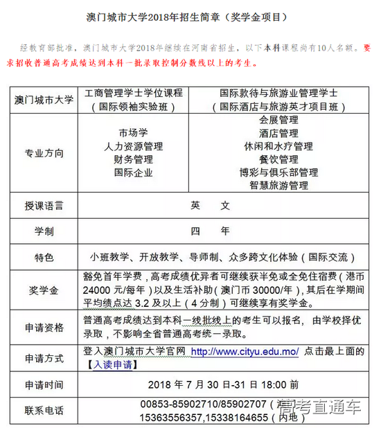 澳门城市大学是澳门特区政府批准设立的综合性大学,具有学士、硕士及博士学位授予权。经教育部批准,2018年继续在我省增加招生,现面向本科一批分数线上考生(一般为未被录取)征集志愿。请符合条件的考生,认真阅读该校招生简章,慎重选报该校志愿。希望到该校就读的考生,于7月30日-31日18:00前,登陆该校官网,按要求网上报名。