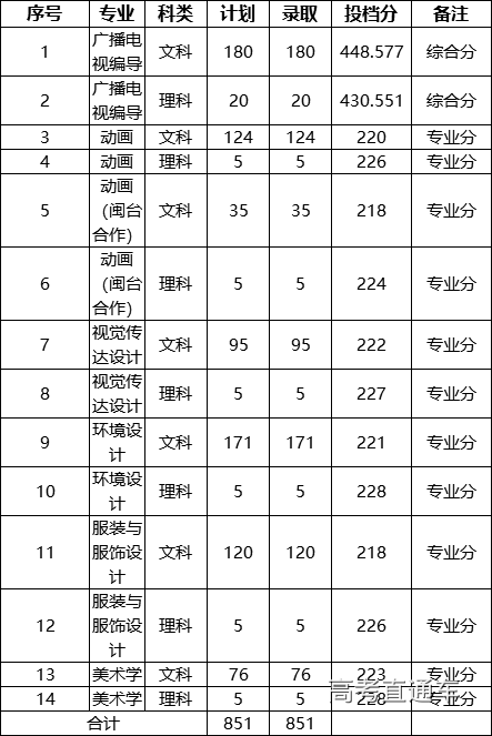 编导文 | 484.4 | 452.45 | 编导类综合分=考生文考投档成绩×70%+考生省级专业统考成绩×2.5×30%。 |