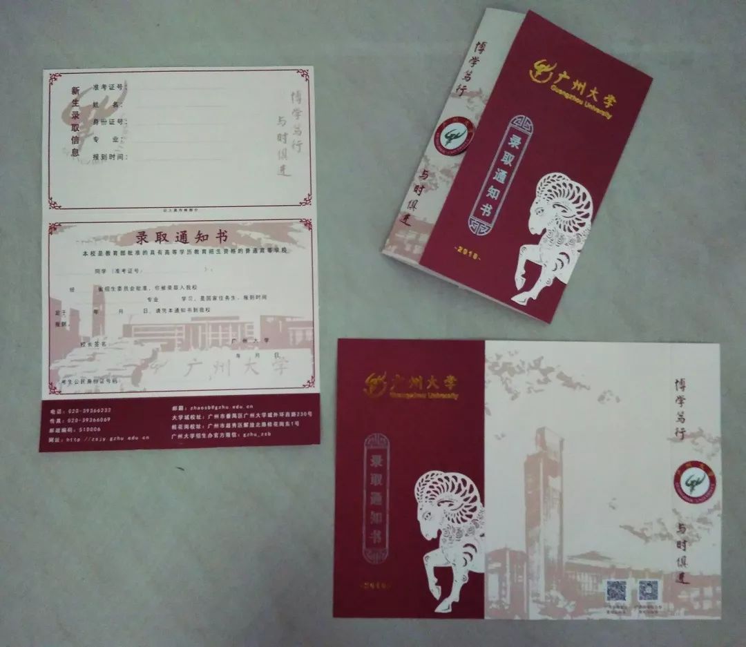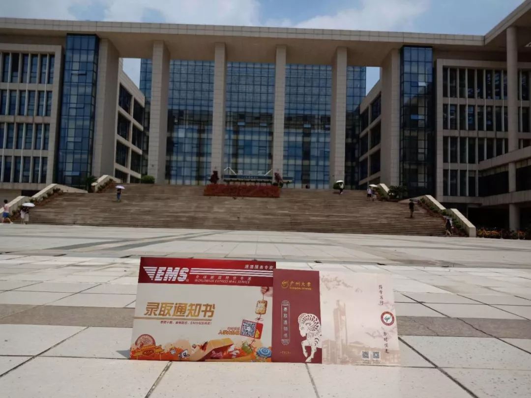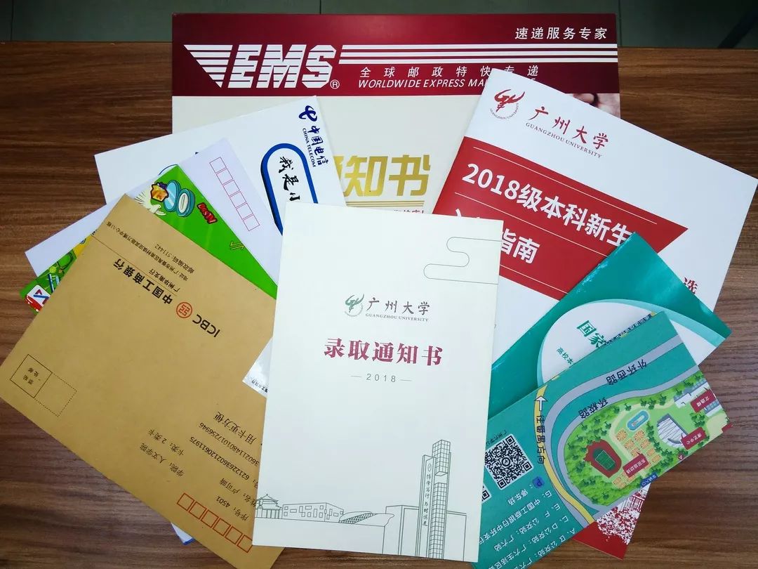 录取通知书正向你飞来 广州大学2018年录取通知书已于今天寄出啦! 2018级的新生很快就可以收到期待已久的快递啦! 请做好接受幸福礼包的准备哦! 幸福礼包,一睹为快! 幸福礼包里面除了期待已久的录取通知书还有2018级本科新生入学指南、广州大学手绘地图以及你的专属银行卡、电话卡等等。 这几天我校工作人员都在加班加点分装和核对录取通知书等材料。 大大的礼包内丰富的内容,你最先想看什么? 录取通知书 今年我校录取通知书主体版面沿用去年广受好评的设计方案,在此基础上,增加了精致典雅的封套。米色的封套上印有校名和校徽以及大学城校区图书馆、一塔湖和部分教学楼的简笔画。录取通知书主体折叠后校园风光、校徽、校训与代表广州的“羊”元素浑然一体,也用这种别致的方式再次表明了我校是一所以国家重要城市命名的综合性大学。 高颜值的录取通知书与校园风光是那么相得益彰,随便一放,就成了一道风景。 入学指南 2018级本科新生入学指南里面有新生报到入学的各项指引、奖助学政策、户口迁移等等,信息量很大,请新生们仔细研读,提前做好各项入学资料的准备。如有疑问,可以根据下表的信息与所在学院学工办的老师取得联系。 各学院学生工作办公室联系方式 手绘地图 手绘地图是今年新增在新生礼包里面的礼物,是由我校美术与设计学院15级动画专业的两位同学绘制的。地图的一面是广州大学3D图,另一面是广州市的平面图。3D图不仅把两个校区的所有建筑和方位都绘制出来了,还把公交站、银行等便民设施也都一一作了标注。广州市平面图则贴心地标出了九月份开学的广州大学新生接站点。手拿手绘地图和新生入学指南,你便和广大相熟了。 大礼包里更多惊喜在这里就不一一剧透啦,相信你一定会喜欢的。 我校统一通过邮政EMS高考录取通知书特快专递寄出录取通知书,收件地址以考生在高考信息系统所填信息为准。考生于八月初即可通过EMS官网(http://www.ems.com.cn/)“高考录取通知书查询”入口以及“EMS中国邮政速递物流”微信公众号两种途径对高考录取通知书特快专递邮件进行全程跟踪查询。 登录EMS官网,点击“高考录取通知书”进入查询系统。输入准考证号: 也可以关注“EMS中国邮政速递物流”公众号,点击“快递服务”菜单进入“高考通知书查询”二级菜单后,输入准考证号进行查询