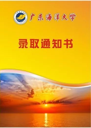 如上图所示,我们广海的录取通知书分为书壳和正文两部分,简洁明了。 书壳 ### 封面 ### 封面上半部分开宗明义,是校徽和“广东海洋大学录取通知书”的字样。 其中校徽标识为圆形,内外双环结构显示了学校上下万众一心、团结努力的精神;内圆中上方为帆的图案,下方为浪图案,表扬帆海洋、乘势而上之意;标有“1935”字样,体现办学历史;外圆上方为“广东海洋大学”汉字字样,下方为英文字样;背景色为湛蓝,体现海洋特色。 封面的下半部分是刚从海平面升起的朝阳,光芒万丈,寓意你们这些刚刚步入大学的小萌新。不过校会君倒是觉得它很像番茄炒蛋呢,哈哈,校会君饿了,没办法。 ### 封底 ### 封底是校长寄语,在这里,叶春海校长表达了对18级新生的热烈欢迎以及殷切期望。 正文 ### 校训 ### 首先映入眼帘的是“广学明德,海纳厚为”。校训以“广东海洋大学”的简称“广海”两字为句头。 “学”,有学习、学问、学识、学理、学说、学术、学科、学校等含义,“广学”,要求师生员工博学、博识、博为,即:广泛学习、广播学问、扩大学校影响力。 “德”,指品行、品质、道德。“明德”,就是认同、践行和彰显美德,体现以德为立校之本、以德为立人之本。 “海纳”,广泛采纳。“厚为”,既有重视行为、勤动手之意,提倡实干精神,培养“三能”应用型人才;也有厚实的作为、大有作为之意,通过厚实的作为来提升社会地位和影响力。 ### 学校照片 ### ### 学校称号 ### ### 正文 ### 正文是属于每个18级新生自己独一无二的宝藏,启封之后,你就和广海荣辱与共、风雨同舟,成为广海的一份子啦! 校会君温馨提示,请大家好好保管录取通知书,因为报到少不了它,而且凭录取通知书及身份证可半价购取火车票一次,仅限本人且只到报到前哈。