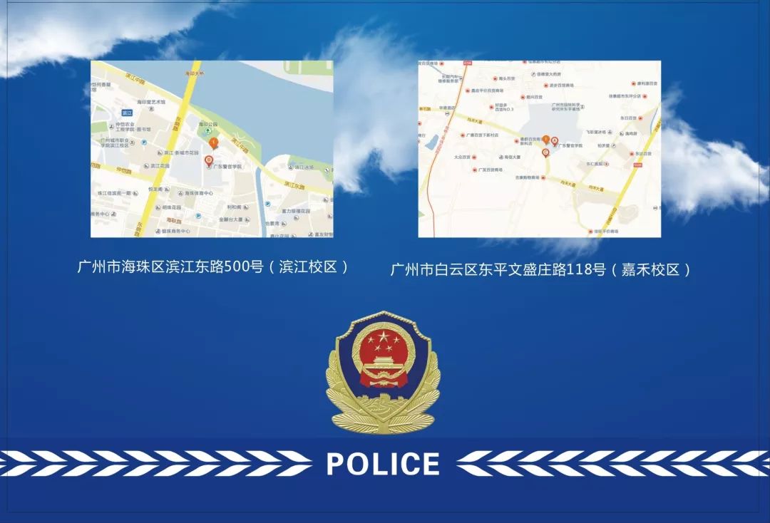 背面一个警徽显眼庄重,加之麦穗装饰,也体现出我们警院特色,蓝天白云的背景也是希望新加入广警大家庭的同学们能够志存高远,并附上广东警官学院两个校区(滨江校区和嘉禾校区)的地址。