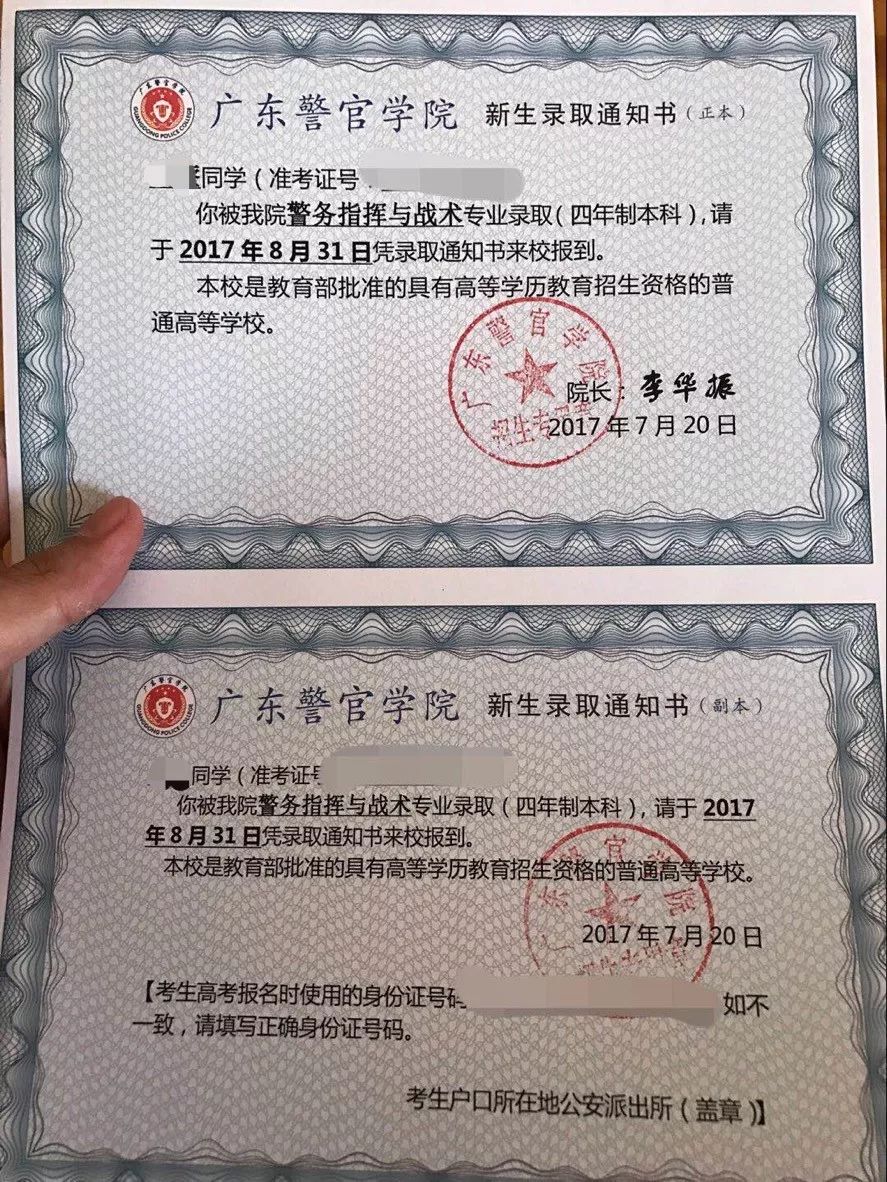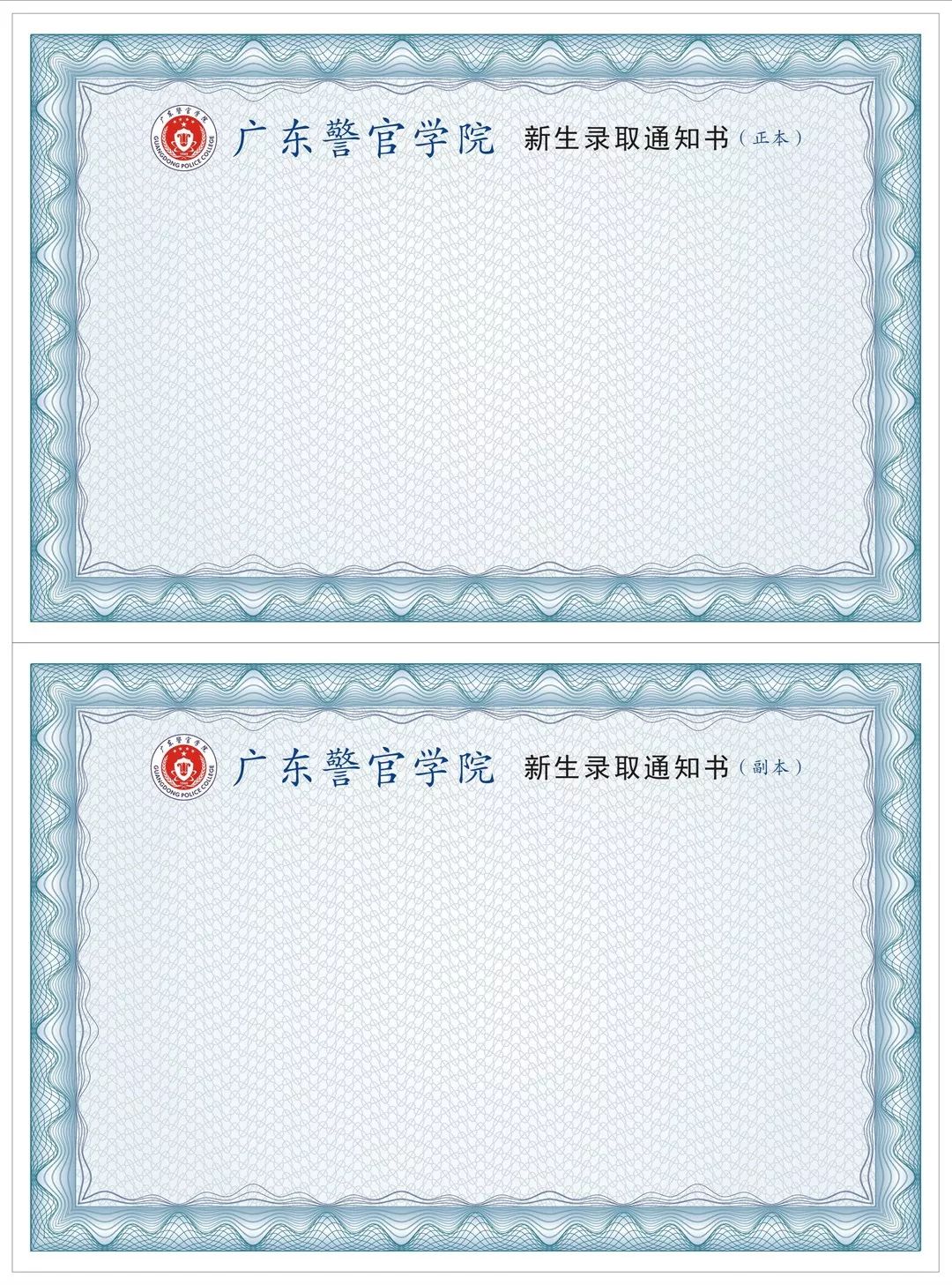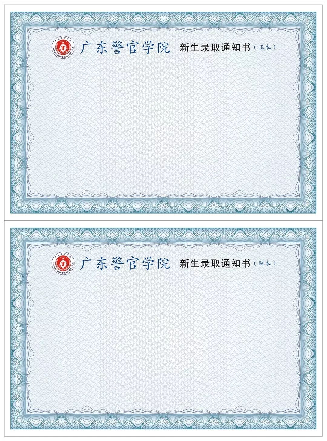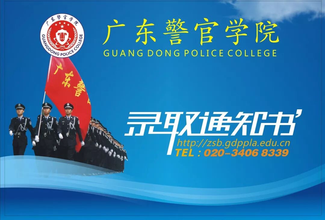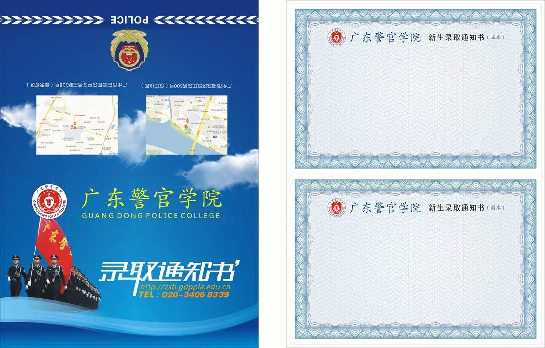 正面是由学院校徽、国旗护卫队携校旗、广东警官学院中英文和录取通知书几个大字共同组成,并配以学院招生网网址以及咨询电话。