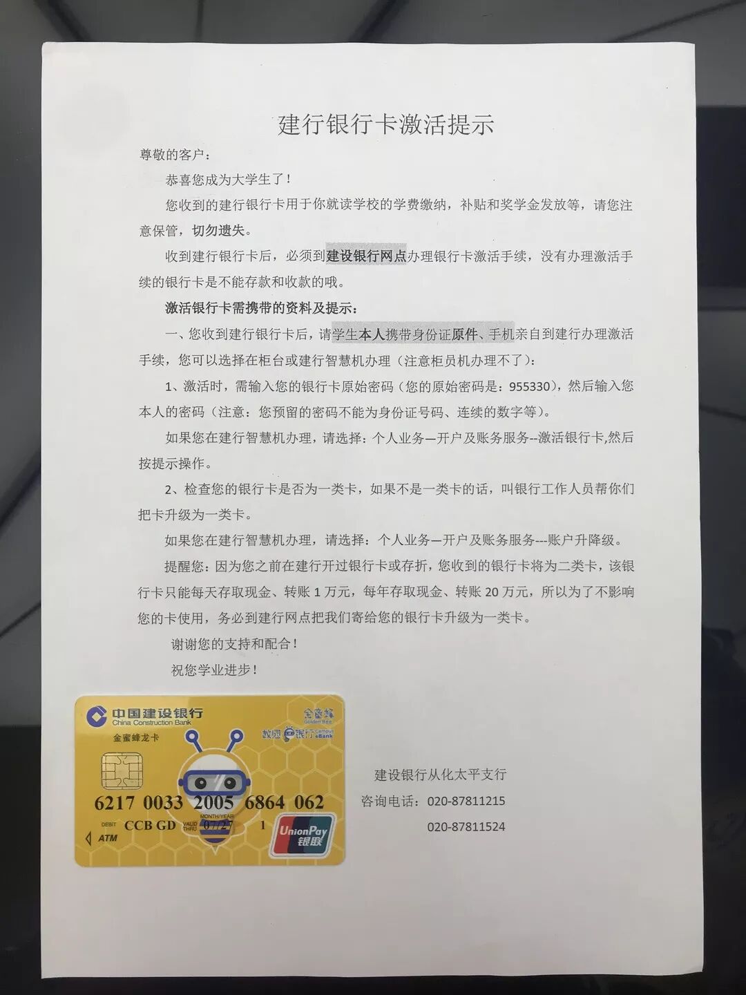 随之看到的是大学新生应征入伍宣传单、致高校青年学生的一封公开信、国家资助政策简介、家庭经济困难学生认定申请表、建设银行卡及银行卡激活提示、新生入学指南、专本同读资料以及校园4G电信卡等材料。