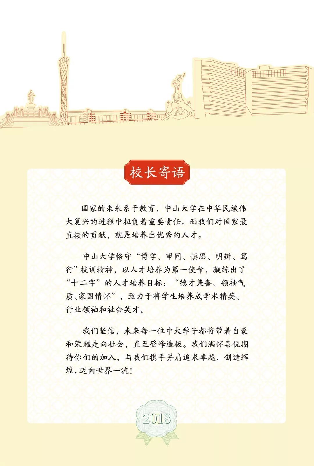 2018年的录取通知书,以岭南地区及中山大学标志性建筑为主体,并采用异形建筑的设计,整体风格有特色而不失厚重,有情怀而不缺新意。通知书采用三折开页的样式,左开页是热烈明艳的木棉红,蕴含深厚的岭南风情;中页与右开页则以淡黄色为主体色调,一面记载着校训和校长寄语,一面为通知书的正文,在庄严校徽下刻印着学子们等待已久的金榜。三折开页错落有致,立体地呈现了中山大学与岭南地区的建筑风光。