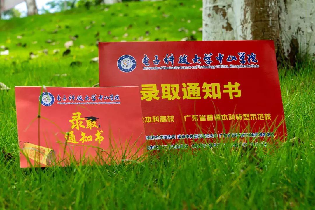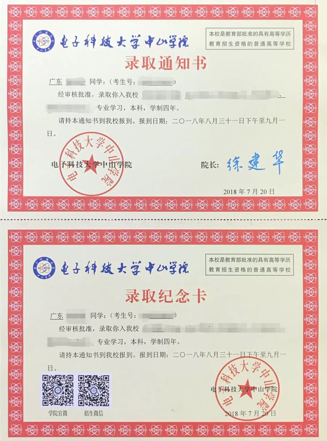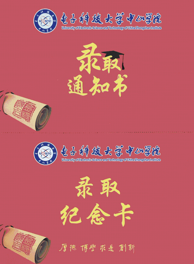 我的 模样 小可爱们见到我的第一眼一定是红艳艳的。上面写着我的各种称号:“省市共建高校”、“广东省普通本科转型示范校”、“城市中央的花园式大学”...... 而这一个红纸皮的外壳将录取通知书大礼包保护得严严实实的,让我安全抵达你的怀里。 我校一直沿用将录取通知书一分为二的设计。一份为正式的录取通知书,方便学生报到时携带,另一份为录取纪念卡,给学生与家长留作纪念。 录取纪念卡上印着我校的校训:“厚德,博学,求是,创新”。 同时,今年一改往年一直沿用的红封面白色内页设计,改用红封面、同色校徽边搭配黄色内页的设计,更显高端大气上档次! 录取通知书 大礼包里有啥 你们以为录取通知书包裹里面只有录取通知书和录取纪念卡吗?Nonono,你们错了!我们的大礼包可谓丰富多彩...... 1 录取通知书以及录取纪念卡 2 我校2018年本科招生指南(帮助你更快了解我校办学情况) 3 2018级学生入学须知(帮助你做好入学前的准备) 4 大学新生应征入伍宣传单 5 新生资助政策简介 6 建设银行的银行卡(用于缴纳学费、考证费用、存储生活费) 7 运营商提供的手机卡 我怎么到 你的怀里 经由招生办公室老师层层把关,相关工作人员将资料尽数装进EMS红纸皮袋子里。 你看!分装好资料的录取通知书包裹整整齐齐地叠放在一旁,红艳艳的,就等着小可爱们的拥抱了! 发出批次 与查询 招生办公室所有老师每天都坚守在岗位上进行繁忙的录取工作,认真把控录取通知书发放的每个环节。 那么哪些小可爱可以拿到我们第一批带着招生办公室老师与工作人员们辛勤汗水的录取通知书呢? 答案揭晓! 广东文理、艺术类的考生,海南省、浙江省以及江苏省艺术类的考生共3854人将拿到我们明天发出的第一批录取通知书。 当然,其他省份的小可爱也不用着急,第二和第三批次的录取通知书也会在8月5日和8月15日左右依次发出。 录取通知书查询方式如下: 1、从我校招生信息网的录取查询页面先查询录取通知书的快递单号,然后到邮政官网上查询快递信息。 2、考生直接输入准考证号就能在邮政官网上查询通知书包裹的动态。(戳左下角阅读原文) 今年九月, 我们在莲峰山等待你 手捧这封红艳艳的录取通知书 踏入电子科大中山学院的大门 开启你人生的新征程!